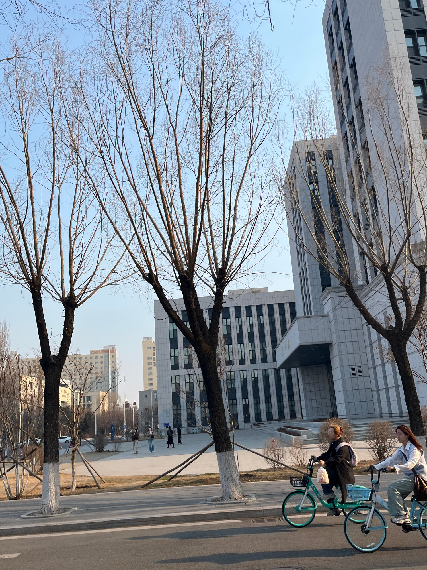 The scene depicts an outdoor university environment at Jilin University in Changchun City, China, under a clear, bright blue sky. In the foreground, an asphalt roadway occupies the lower portion of t…read more