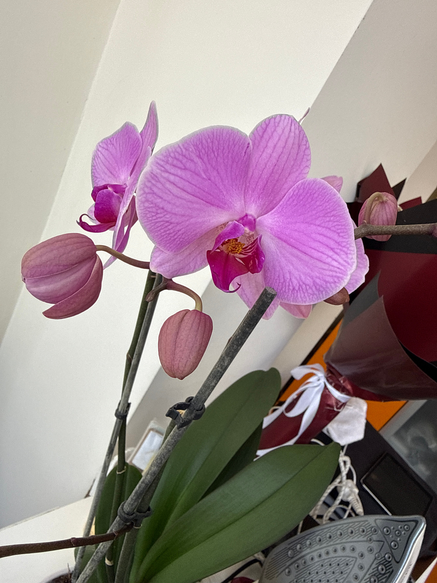 The image displays an indoor scene featuring a blooming Phalaenopsis orchid plant in Alanya, Turkey. The plant is situated against a plain white or off-white wall, which features a diagonal architectu…read more