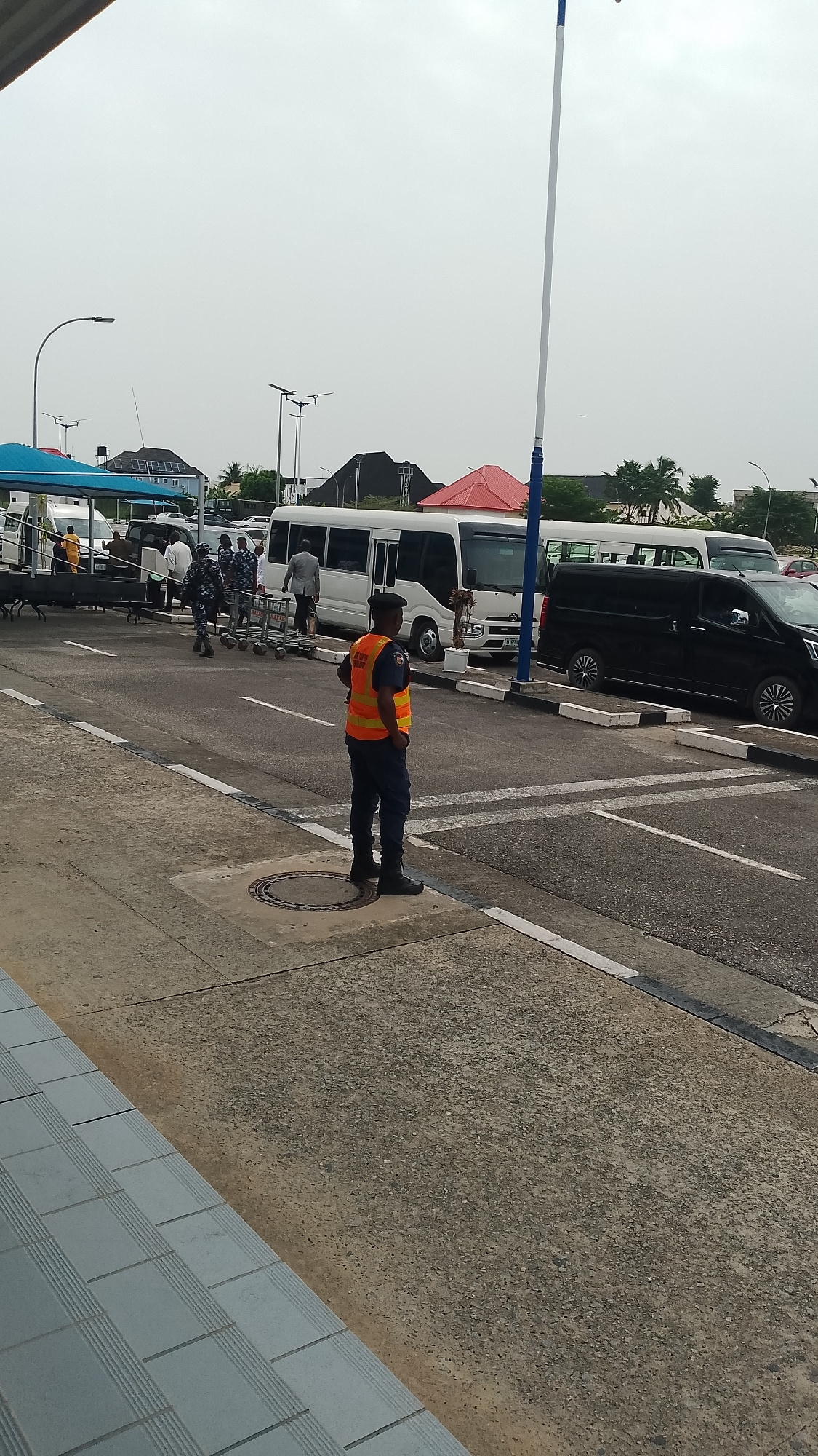 The image depicts a street scene in Orerokpe, Nigeria, with a uniformed security guard standing on a concrete platform near a road. The guard wears a dark uniform with a bright orange vest. Several ve…read more