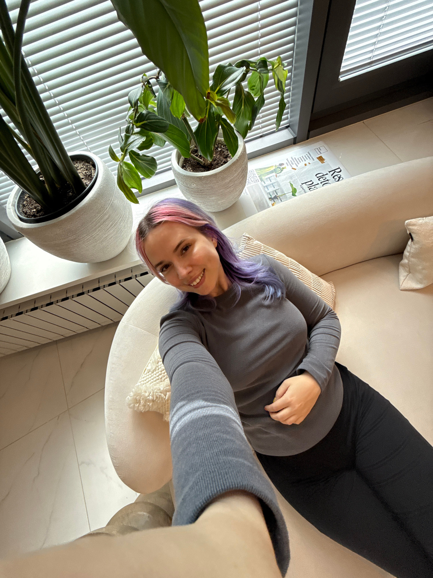 An adult female, with pink and purple hair, is depicted in a selfie within an indoor setting in the City of Zagreb, Croatia. She is positioned on a light-colored, curved sofa, wearing a grey long-slee…read more