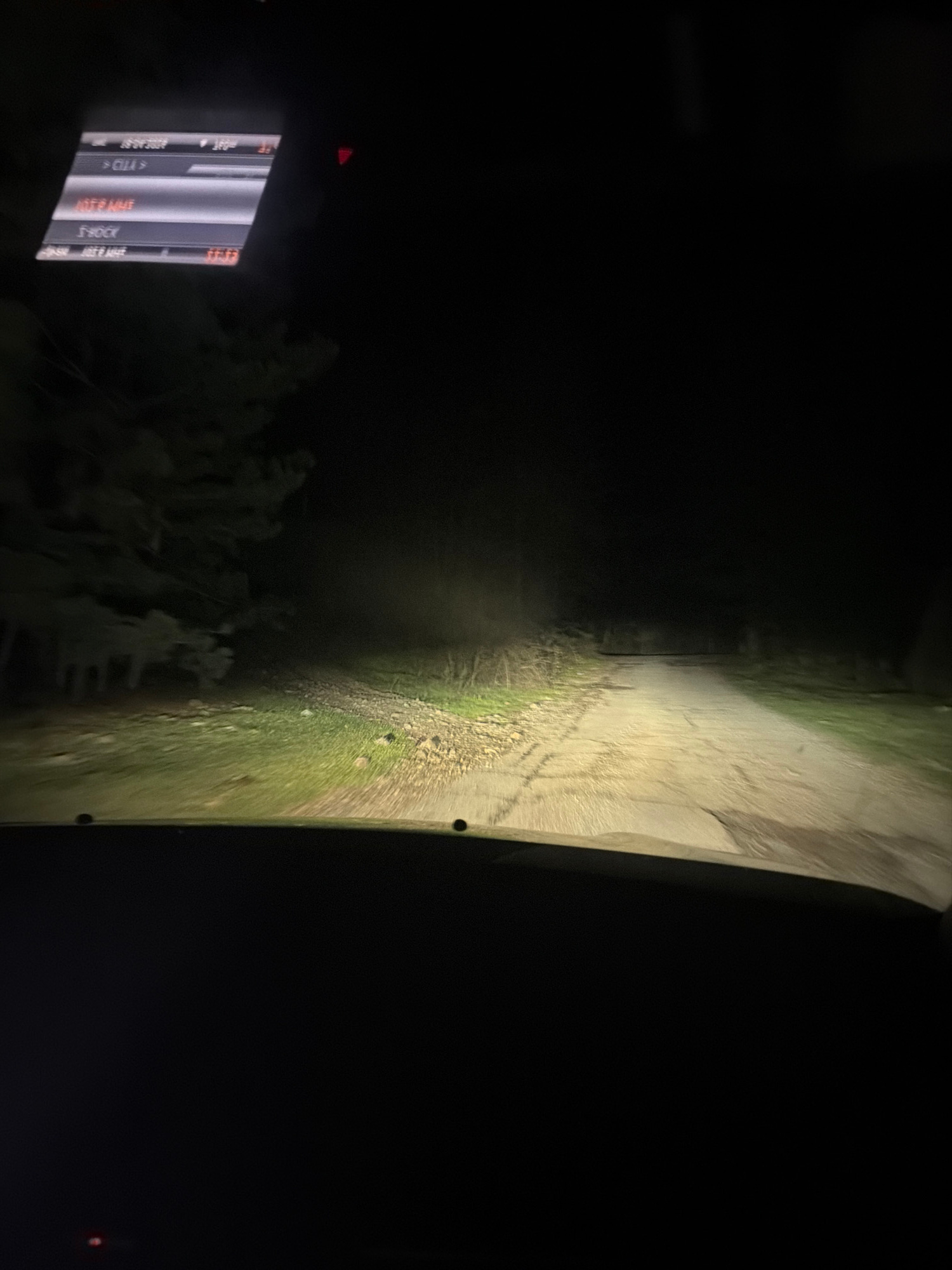 The image appears to be taken from inside a vehicle, looking out through the windshield. The scene depicts a dark road illuminated by the vehicle's headlights. The road surface appears to be asphalt o…read more