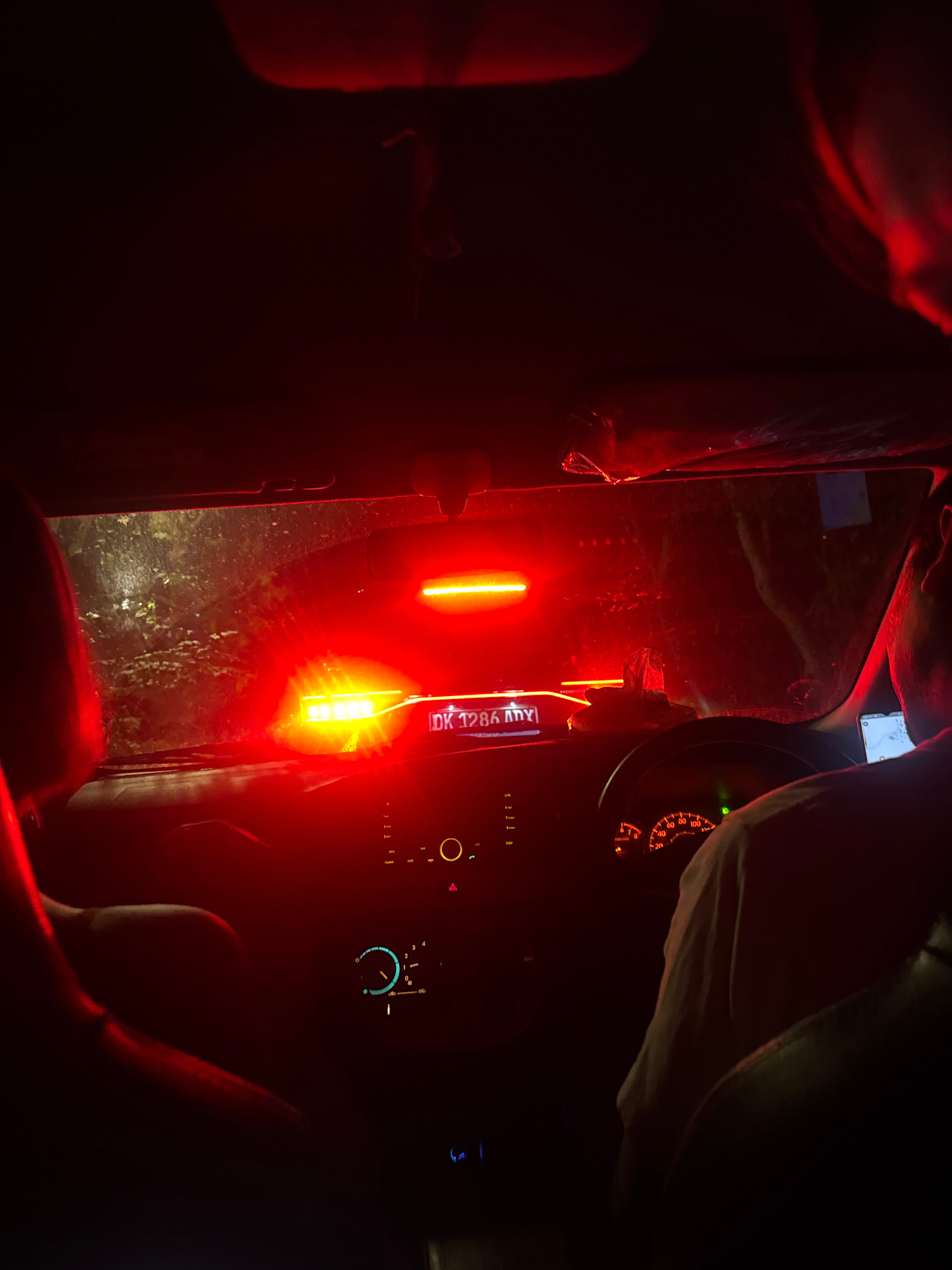 The image, heavily dominated by red illumination, shows the interior of a car at night, with the apparent location being Kuta Selatan, Indonesia, as inferred from the obscured number plate "DK 128A my…read more