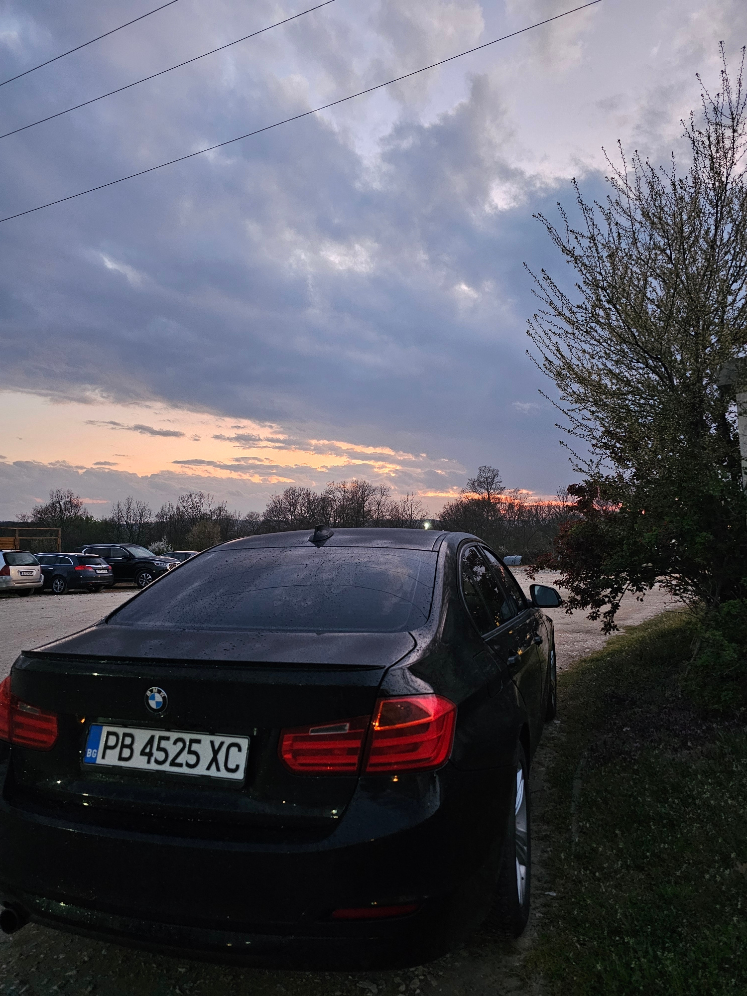 The image depicts the rear of a black BMW sedan parked along a roadside in Krasnovo, Bulgaria. The vehicle's license plate reads "PB 4525 XC". The car is damp, possibly from rain. The background shows…read more