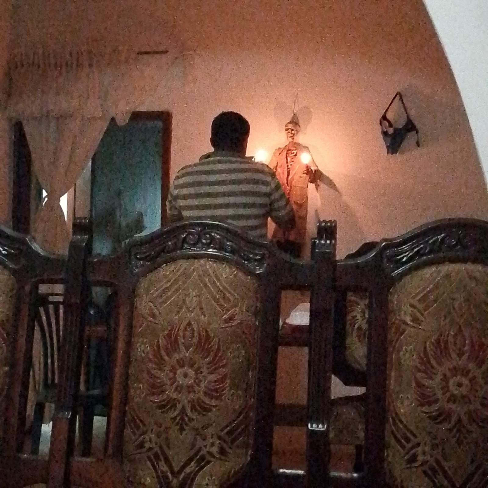 A person in a striped shirt sits in front of a skeleton figure holding lights. The skeleton is wearing a coat and hat. Behind the person is an open doorway with a curtain. A black object, possibly linβ¦read more