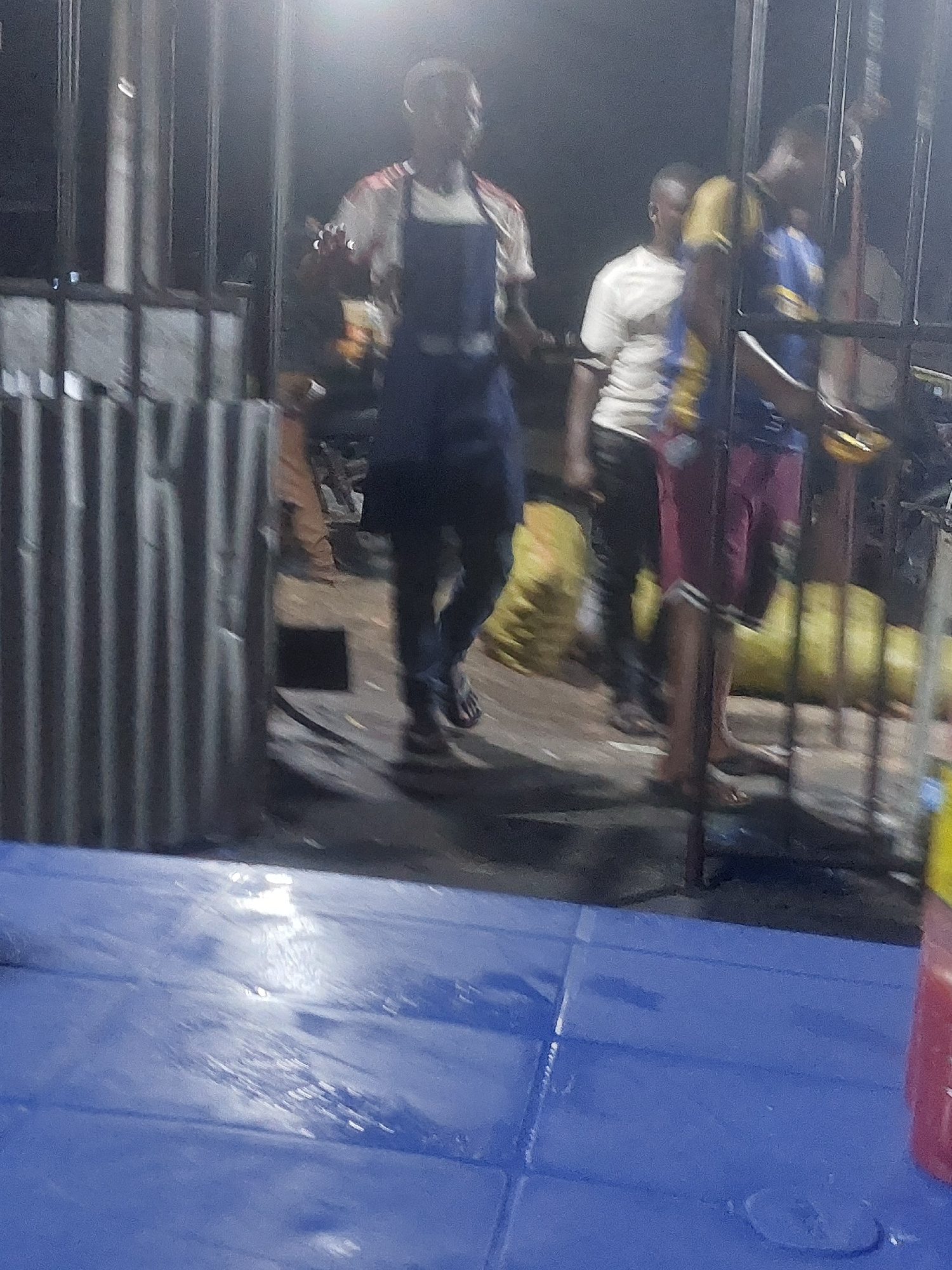 A dimly lit outdoor scene shows a group of people near what appears to be a shop or market stall. Several individuals are visible, some standing and interacting with the items on display. The scene su…read more