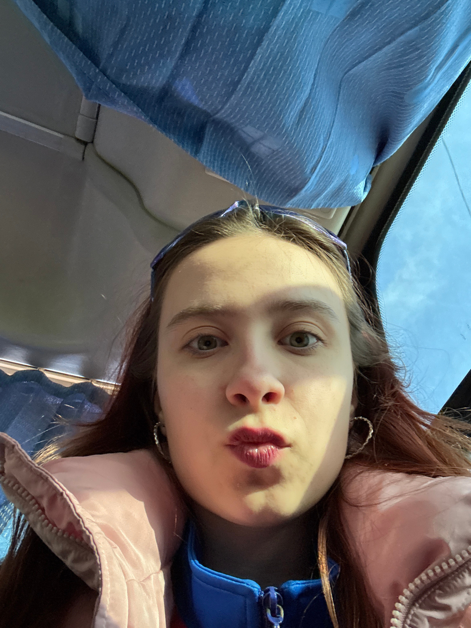 A close-up, angled selfie of a young woman with fair skin, light eyes, and auburn hair. She is wearing a blue headband and hoop earrings. Her lips are colored with red lipstick. She is wearing a pinkβ¦read more