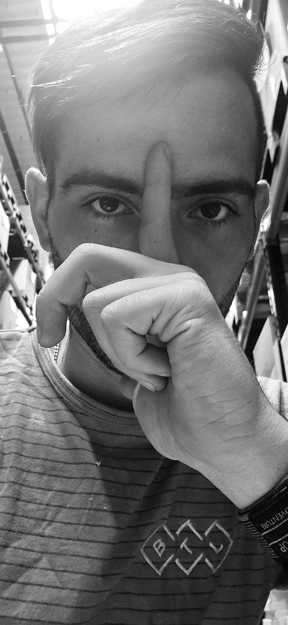 A medium-shot black and white image shows a man's face and hand in the foreground, oriented as though the viewer is looking up at him. The man's head is tilted to the left; his eyes are visible, and t…read more
