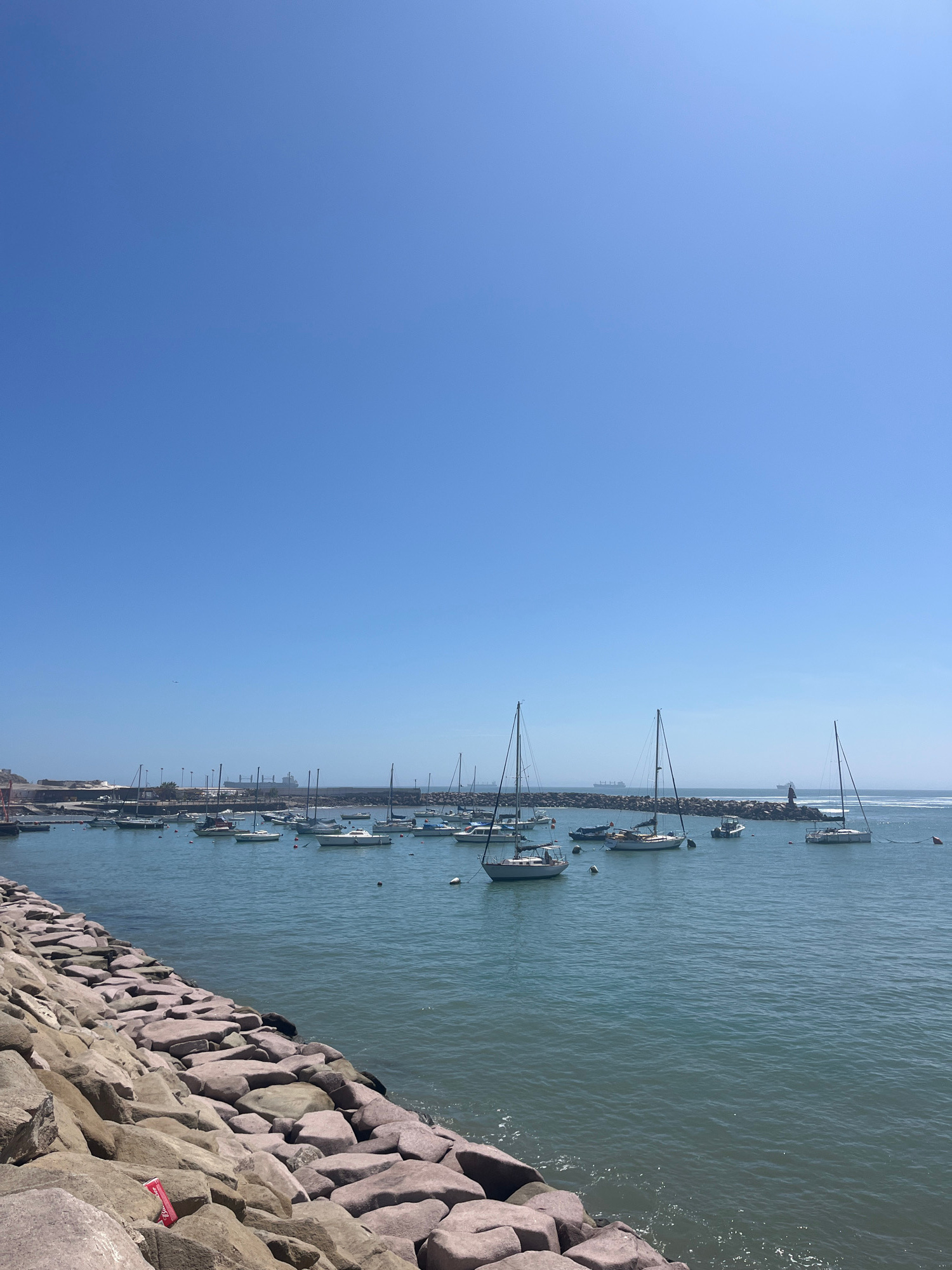 The image depicts a harbor scene in Arica, Chile, taken from a position on a rocky breakwater. The breakwater consists of large, angular stones. To the left of the breakwater, the harbor is filled witβ¦read more