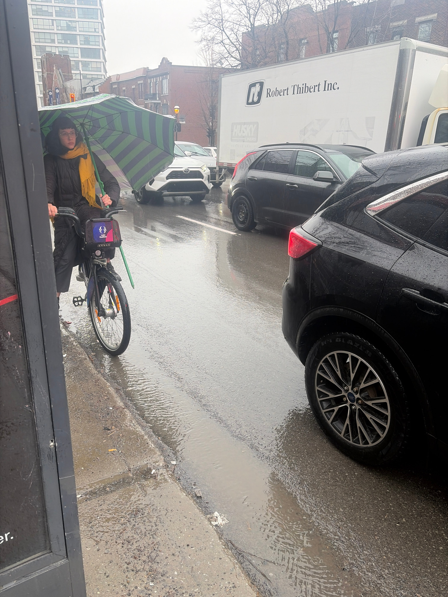 An outdoor urban scene depicts a person on a bicycle on a wet street, likely during or after rainfall. The ground is covered in puddles, reflecting the overcast sky. The central figure is a person wea…read more