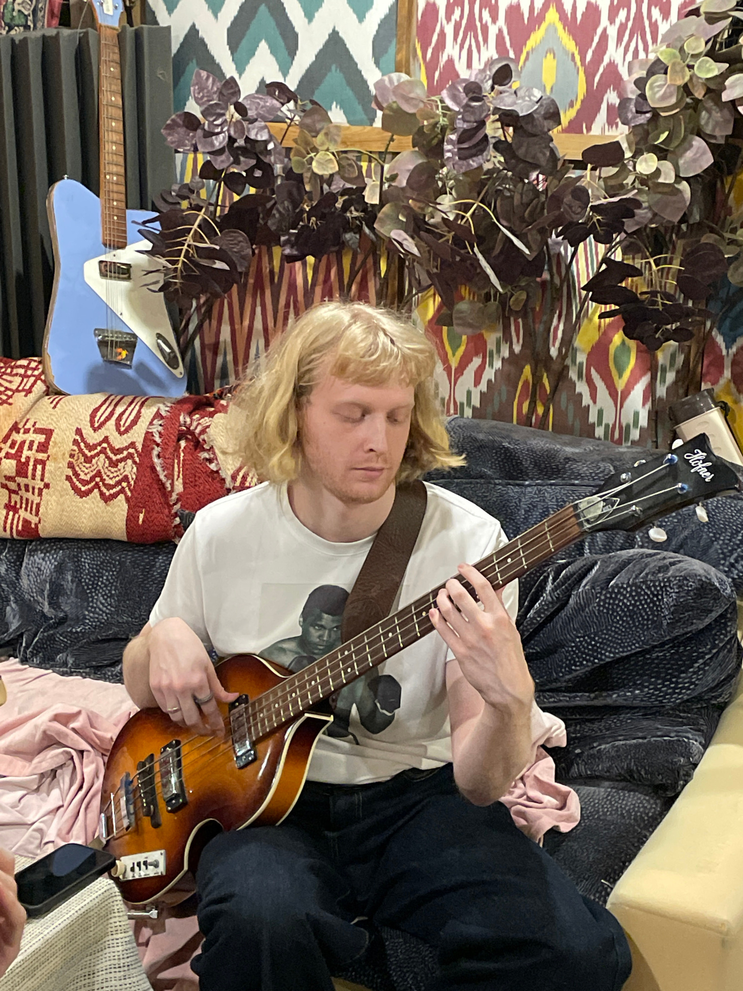A man with blonde hair is seated, eyes closed, playing a brown and tan Hofner bass guitar. He is wearing a white t-shirt. A light blue electric guitar rests on a red patterned blanket next to him. Dec…read more