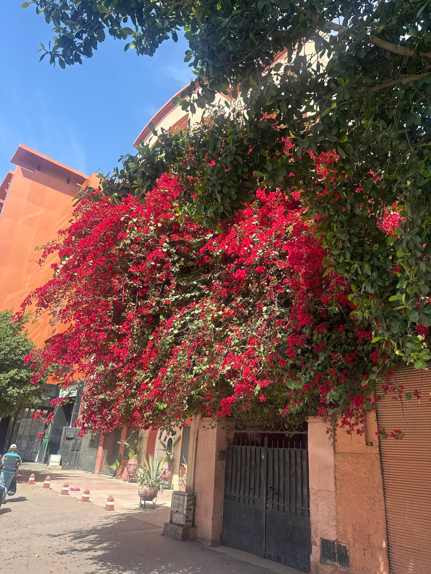 A street scene in Marrakesh, Morocco, with a heavy bougainvillea shrub cascading down the side of a peach-colored building. A closed dark gate is visible on the building. The ground shows shadows and…read more