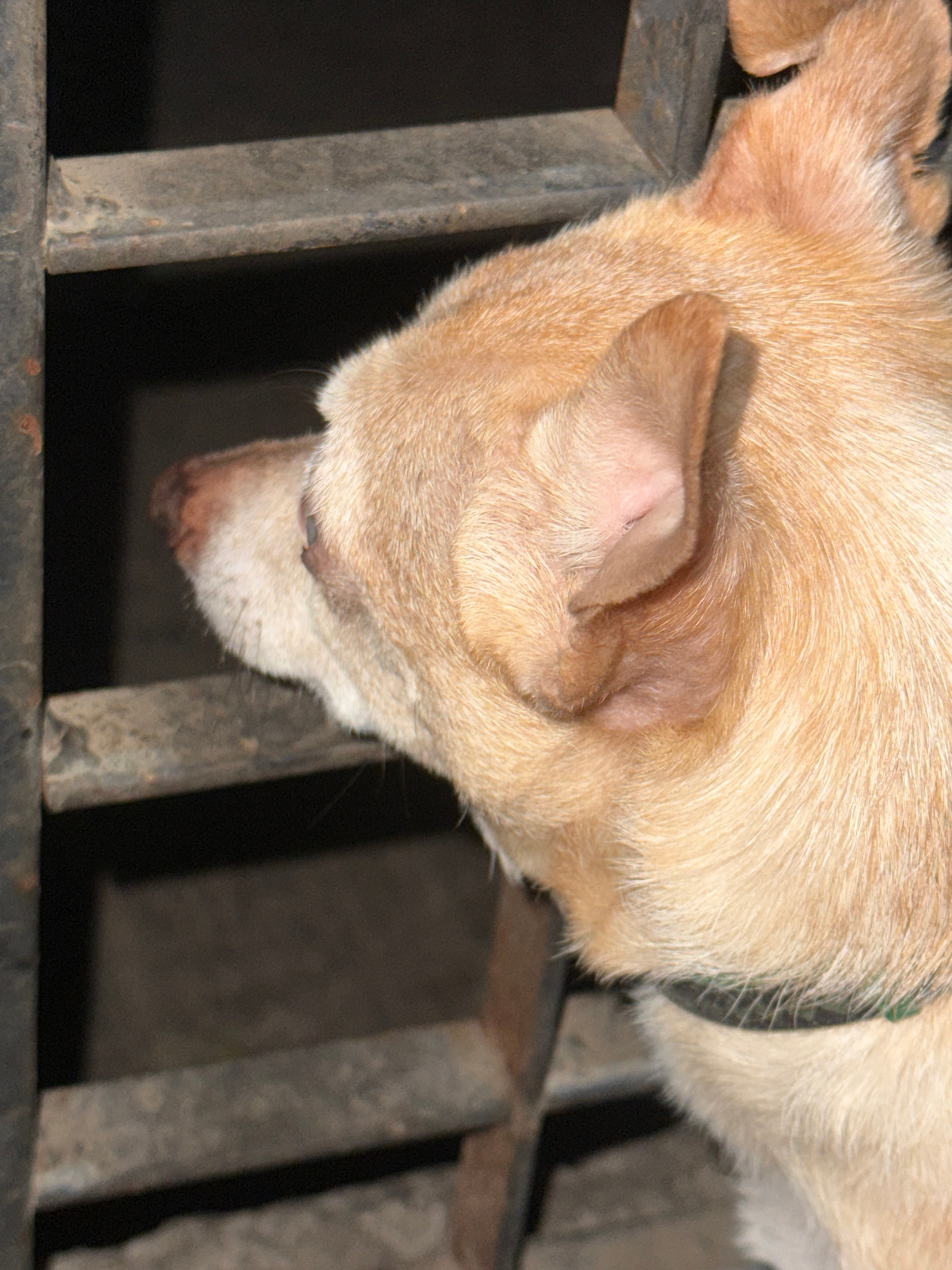 A tan dog with short fur and a black collar peers through a weathered metal grate. The dog's head is tilted downward, its nose close to the grate. The setting appears to be outside, possibly a street…read more