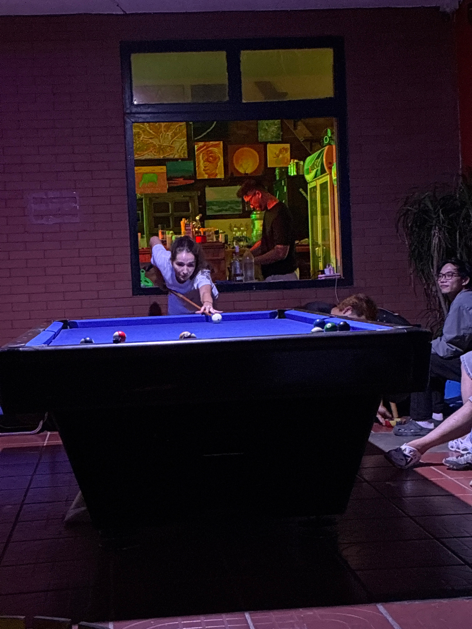 A dimly lit room reveals a pool table in the foreground, with a person in a white shirt leaning over it, cue in hand, about to take a shot. In the background, a window reflects the interior of a bar,…read more
