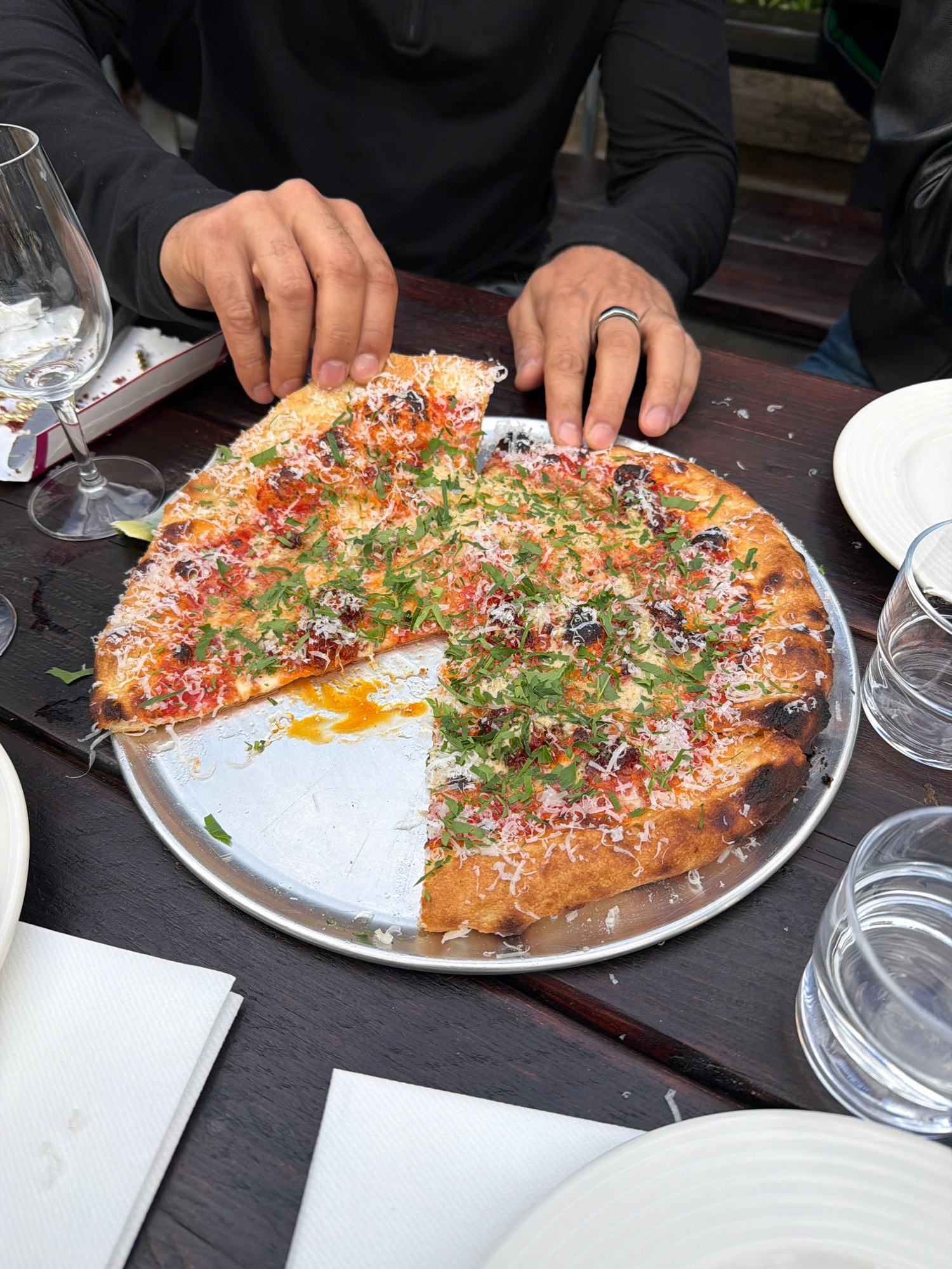 The image shows a person taking a slice of pizza from a metal tray on a dark wooden table. The pizza is round with a golden-brown crust, topped with red sauce, small dark-colored pieces, shredded whit…read more