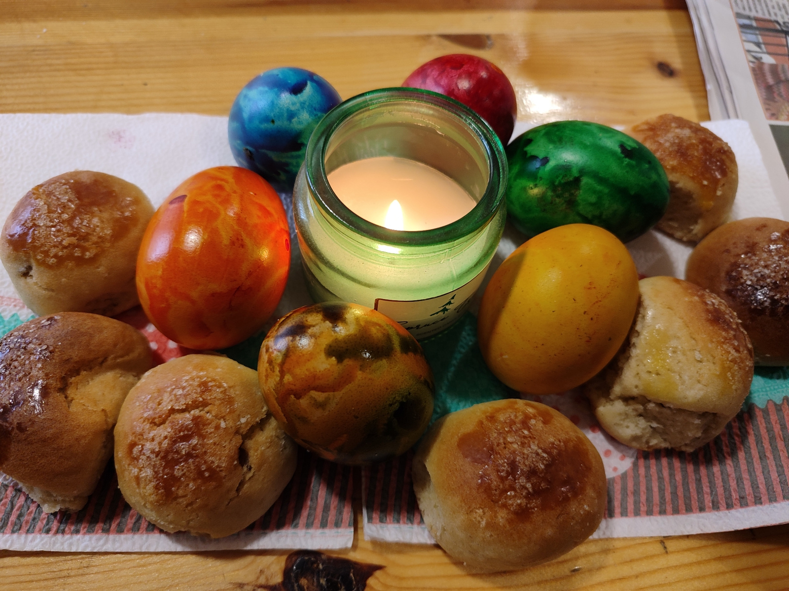 On a wooden surface, likely a table, a white paper towel with red and green stripes holds a collection of objects. Arranged around a lit candle in a green glass jar are seven Easter eggs dyed in varioβ¦read more