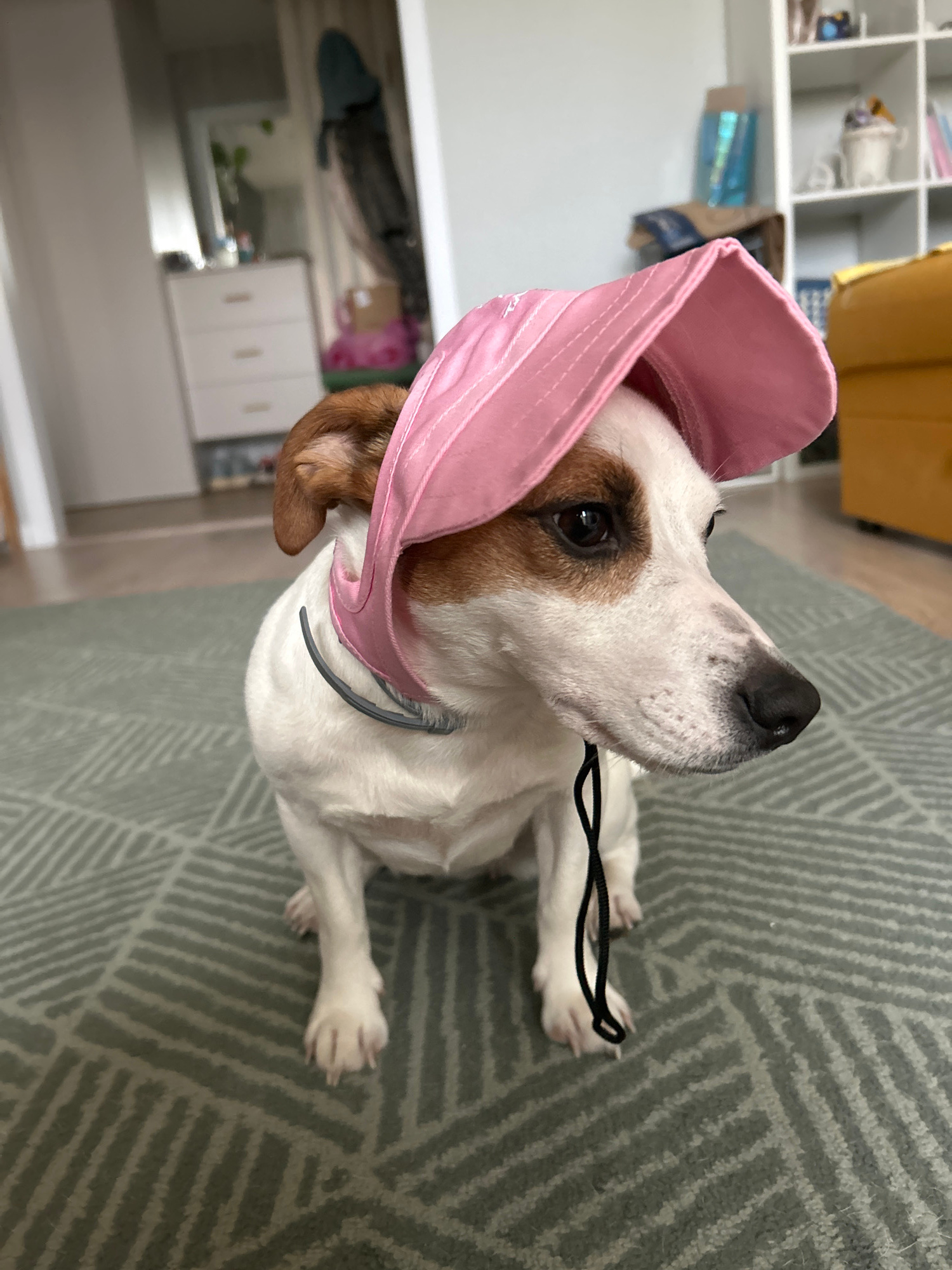 A light-colored dog, possibly a Jack Russell Terrier or a similar breed with white fur and brown patches on its head, is the central subject of this indoor photograph. The dog is positioned on a grey…read more