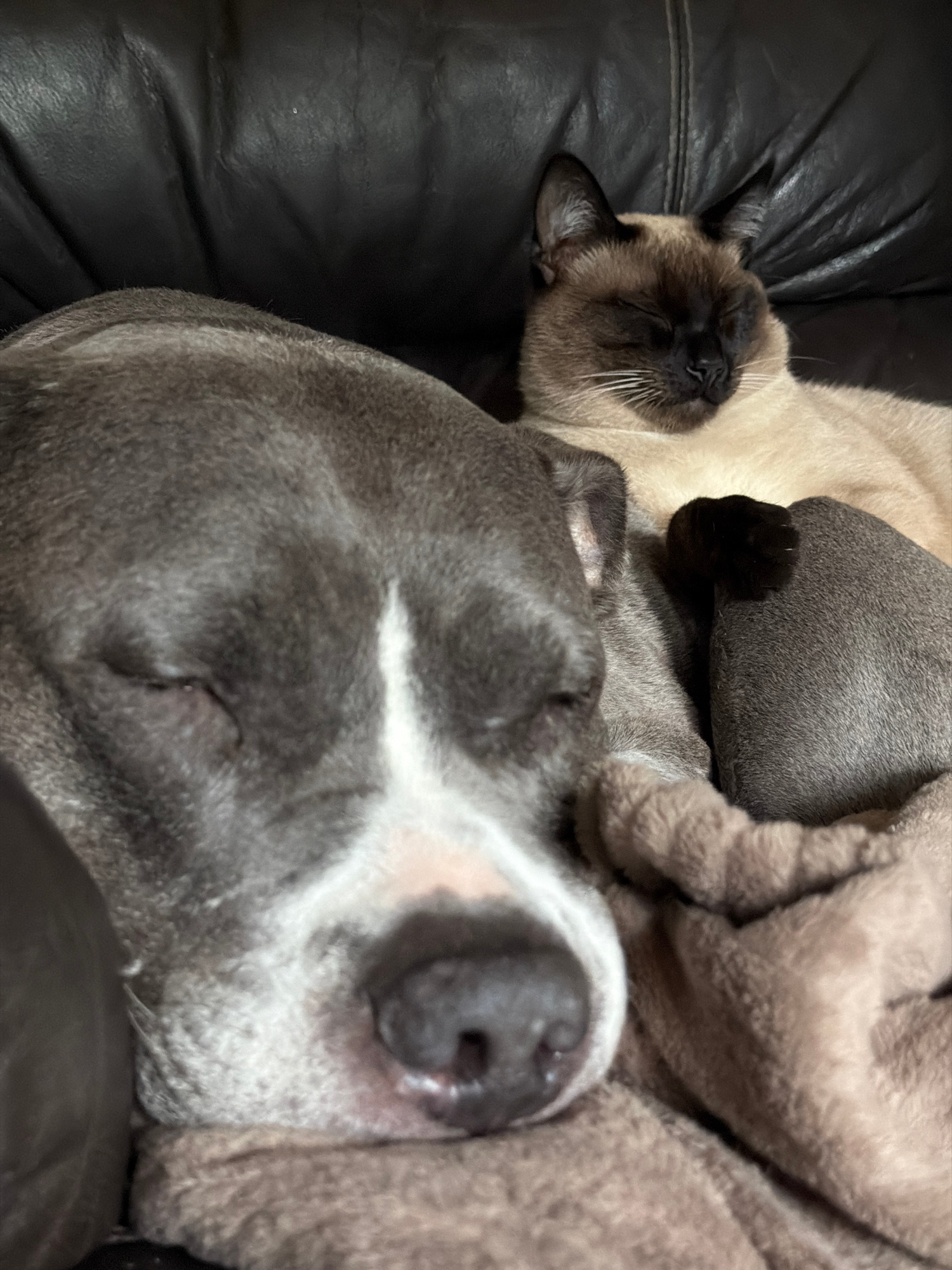 The image shows a Siamese cat and a gray and white dog sleeping together on a dark leather surface, likely a couch. A gray blanket is draped over part of the dog. The cat is positioned to the left, it…read more
