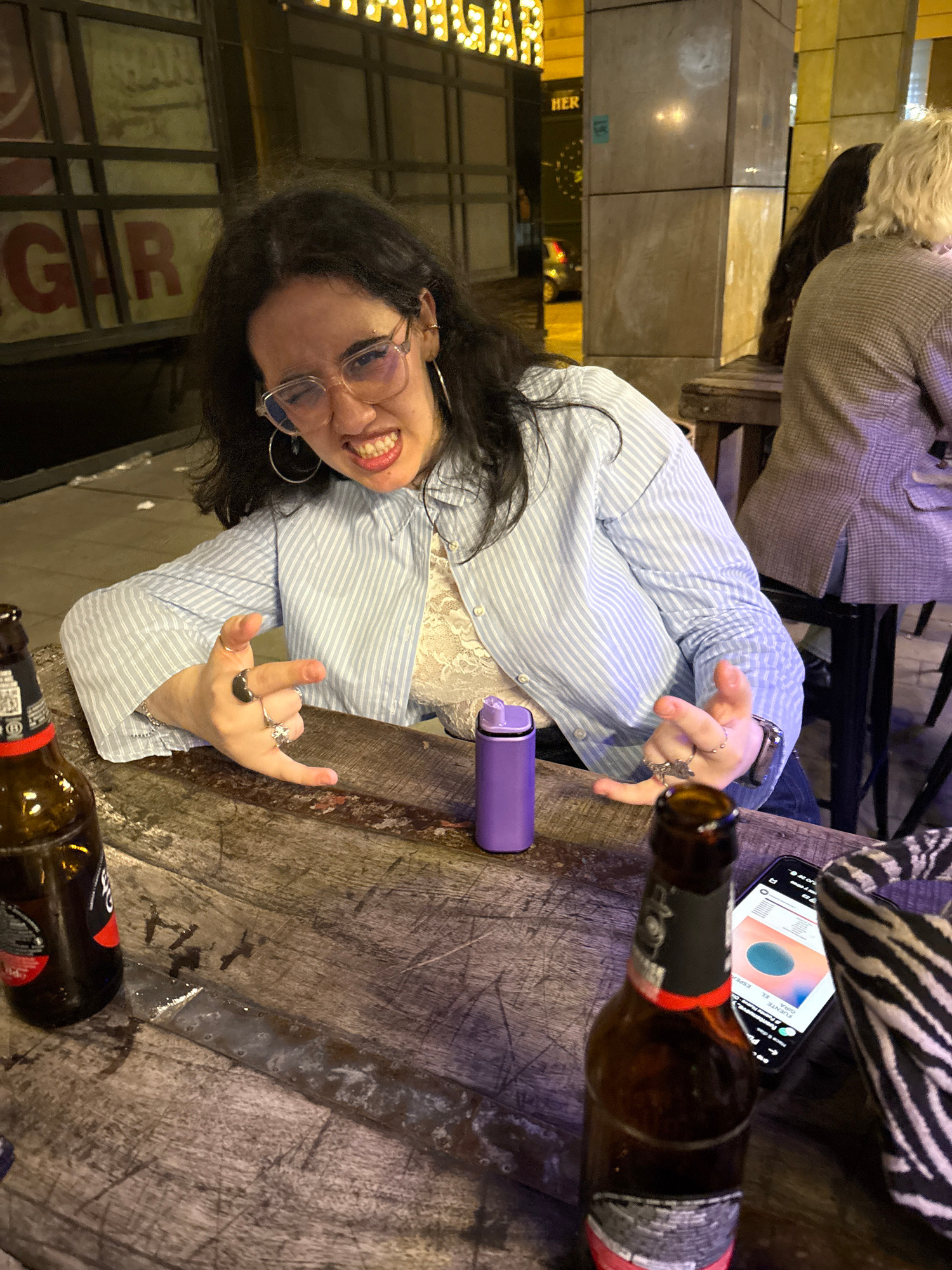 A woman with dark hair and glasses sits at a weathered wooden table in what appears to be a bar or restaurant. She is wearing a light blue striped shirt over a white lace top. She's making a rock-on g…read more