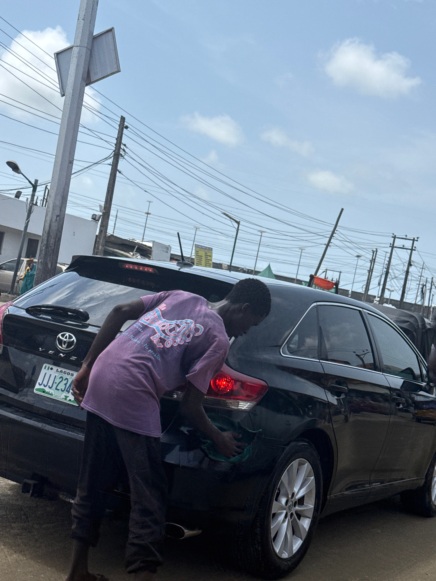 A man is washing the back of a black car. The license plate reads "JJJ 234", indicating Lagos, Nigeria. The location appears to be an outdoor setting in the city of Ado, Nigeria, as the image shows ut…read more