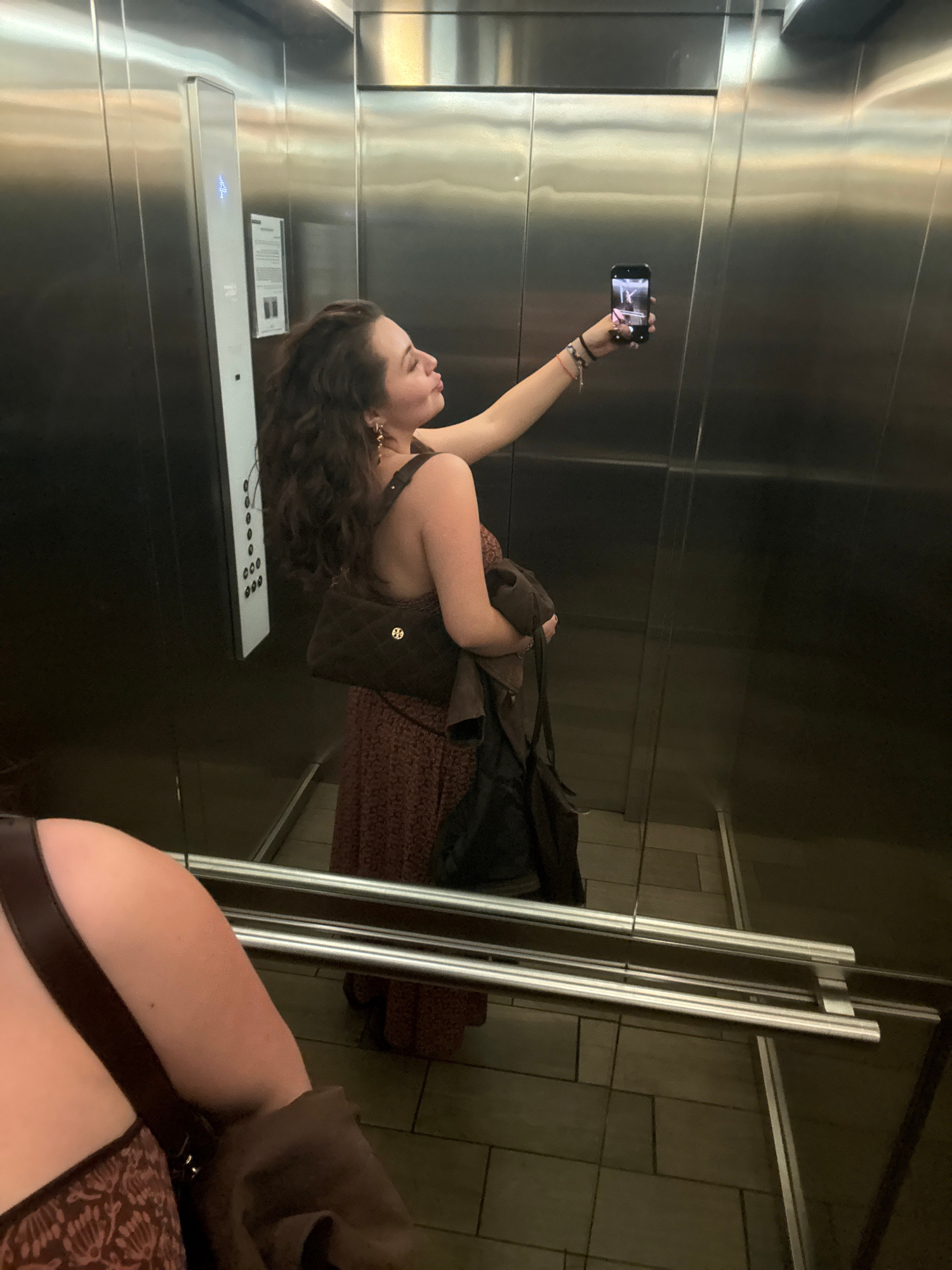 A young woman is taking a selfie in an elevator, likely in Mexico City, Mexico. She is holding a smartphone up with her right hand, her arm extended towards the top left corner of the frame. The eleva…read more