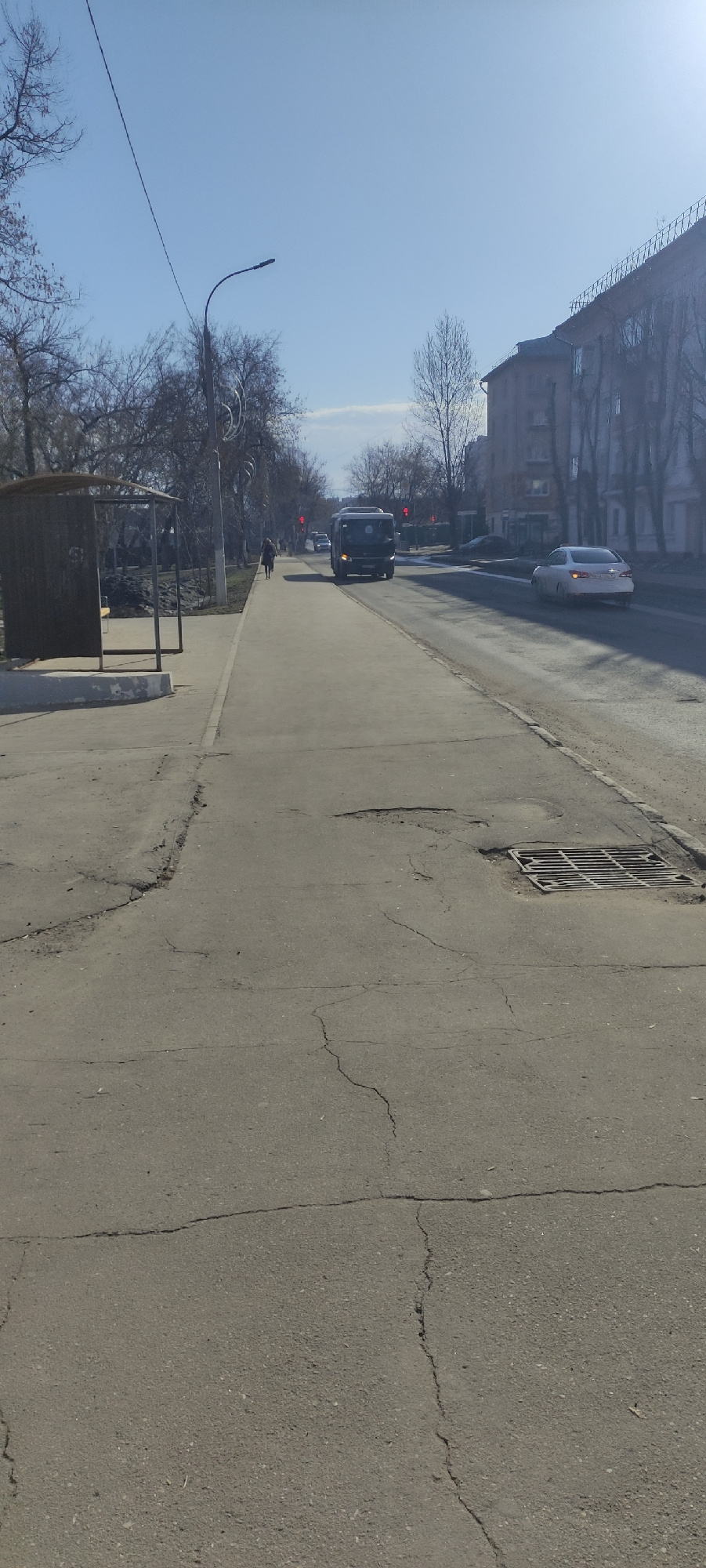 The image shows a street in Fryazino, Russia. The street has cracked asphalt and a manhole cover is visible. In the background, there are buildings and trees. Two cars are driving on the street. There…read more