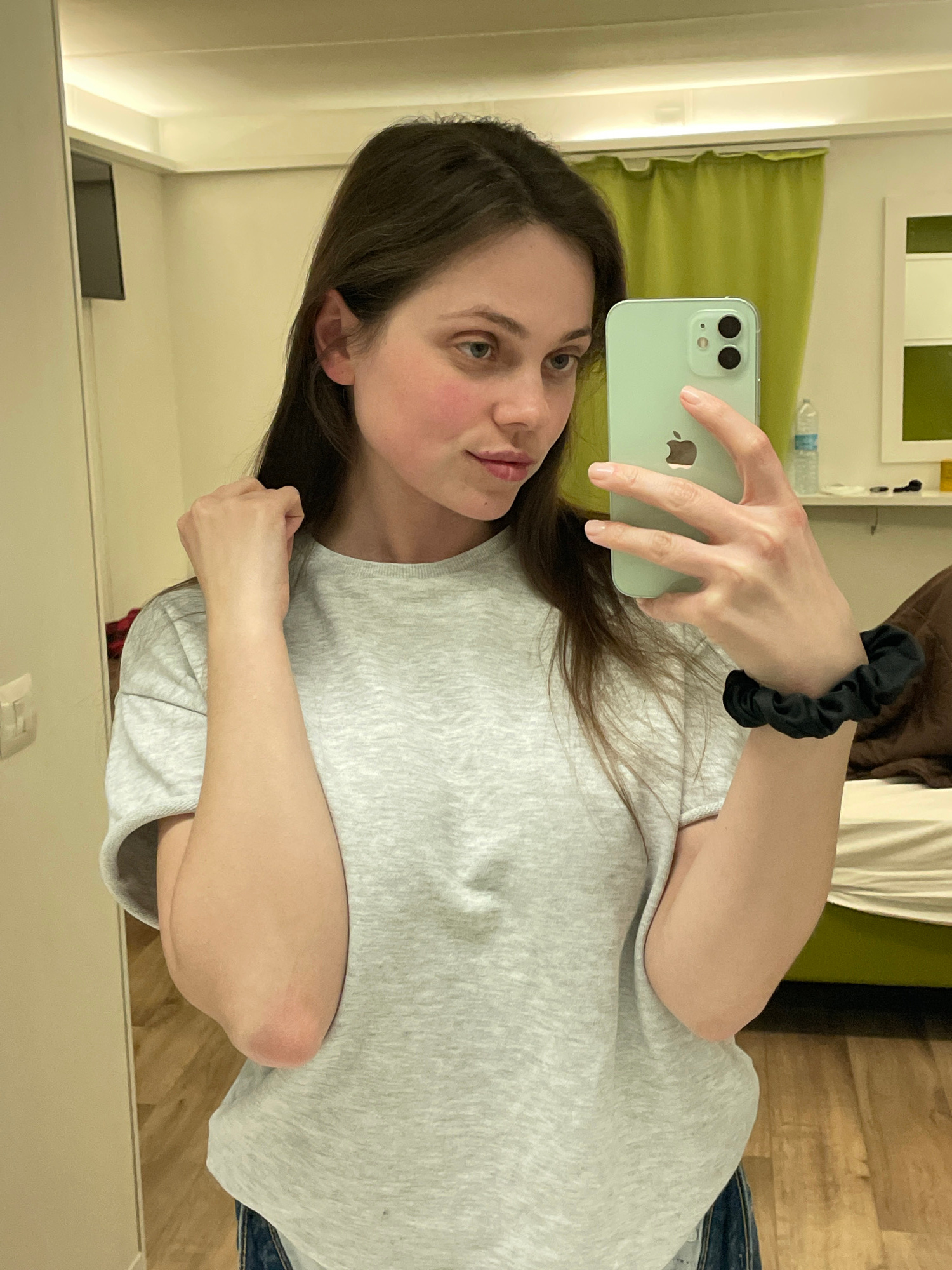 A woman is taking a selfie in a room. She is holding a light green iPhone in her right hand, which is positioned in front of her face. She has dark hair and is wearing a light gray T-shirt and a black…read more