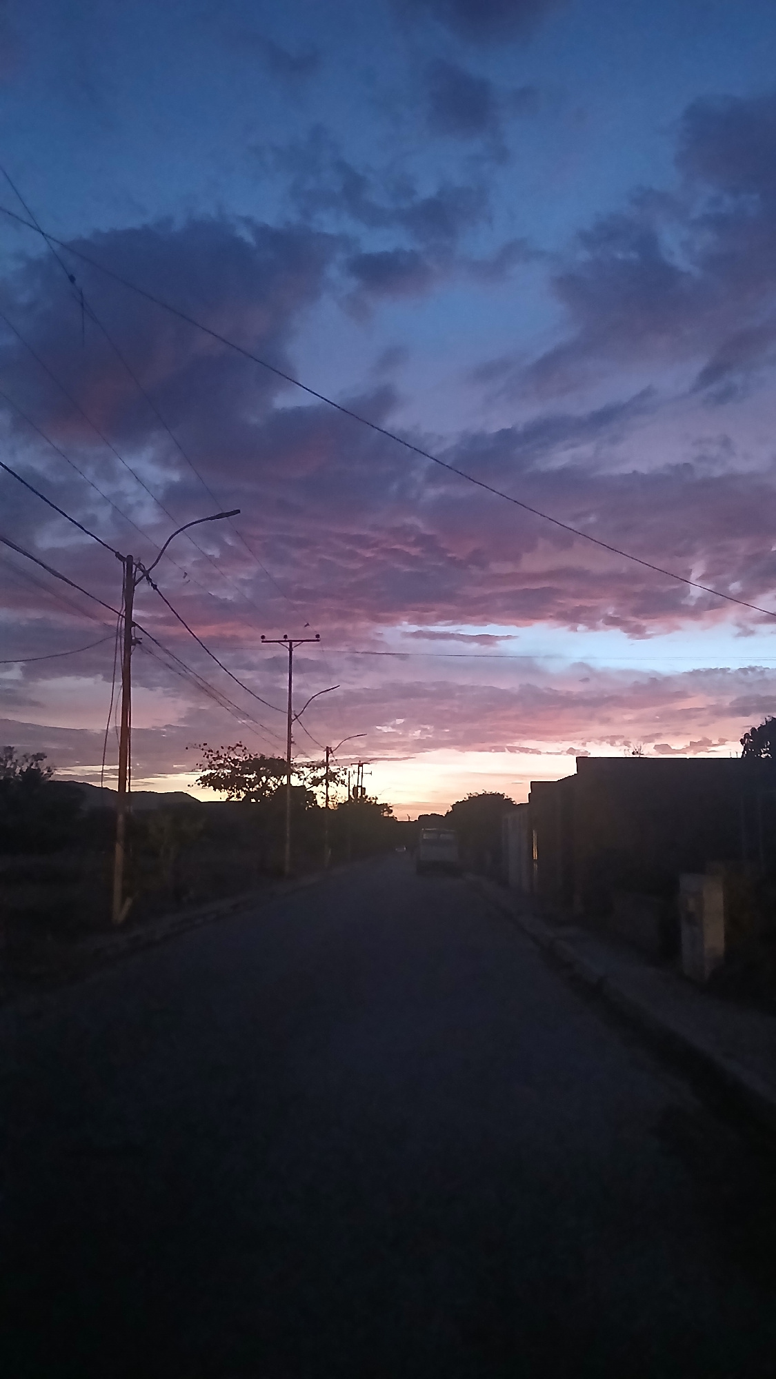 The image shows a street scene in Altagracia, Venezuela, at dusk or dawn. The sky is filled with clouds, transitioning from blue to pink and orange hues. Utility poles with wires run along the left si…read more