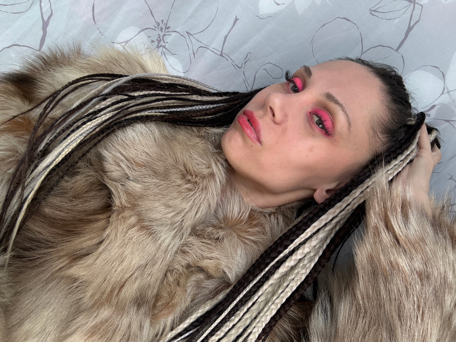 A person is lying down in an indoor setting. The individual has braids in their hair, with alternating black and white strands. The person is wearing pink makeup on their eyelids and lips. They appearβ¦read more