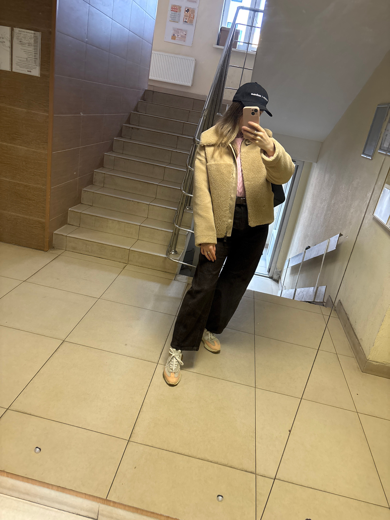 A young person stands in a building in Kudrovo, Russia, taking a selfie. They are wearing a black baseball cap, a tan sherpa jacket over a pink top, dark pants, and light-colored sneakers. The individ…read more