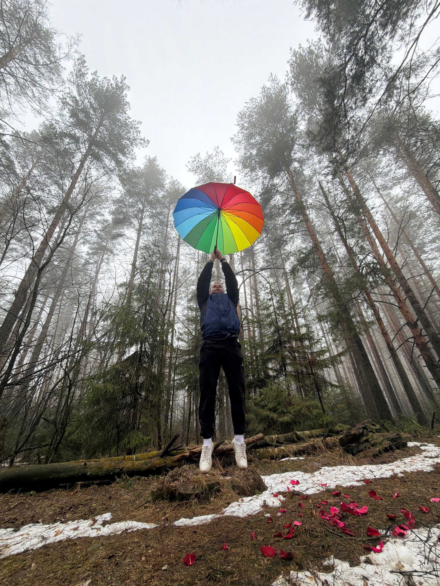 A person stands in a forest in Прикамский, Russia, holding a rainbow-colored umbrella above them. The person is wearing dark clothing and white sneakers. The ground is covered in brown vegetation, with patches of snow and scattered red rose petals. Tall trees surround the person, their bare branches reaching into a hazy sky. | Open Wire