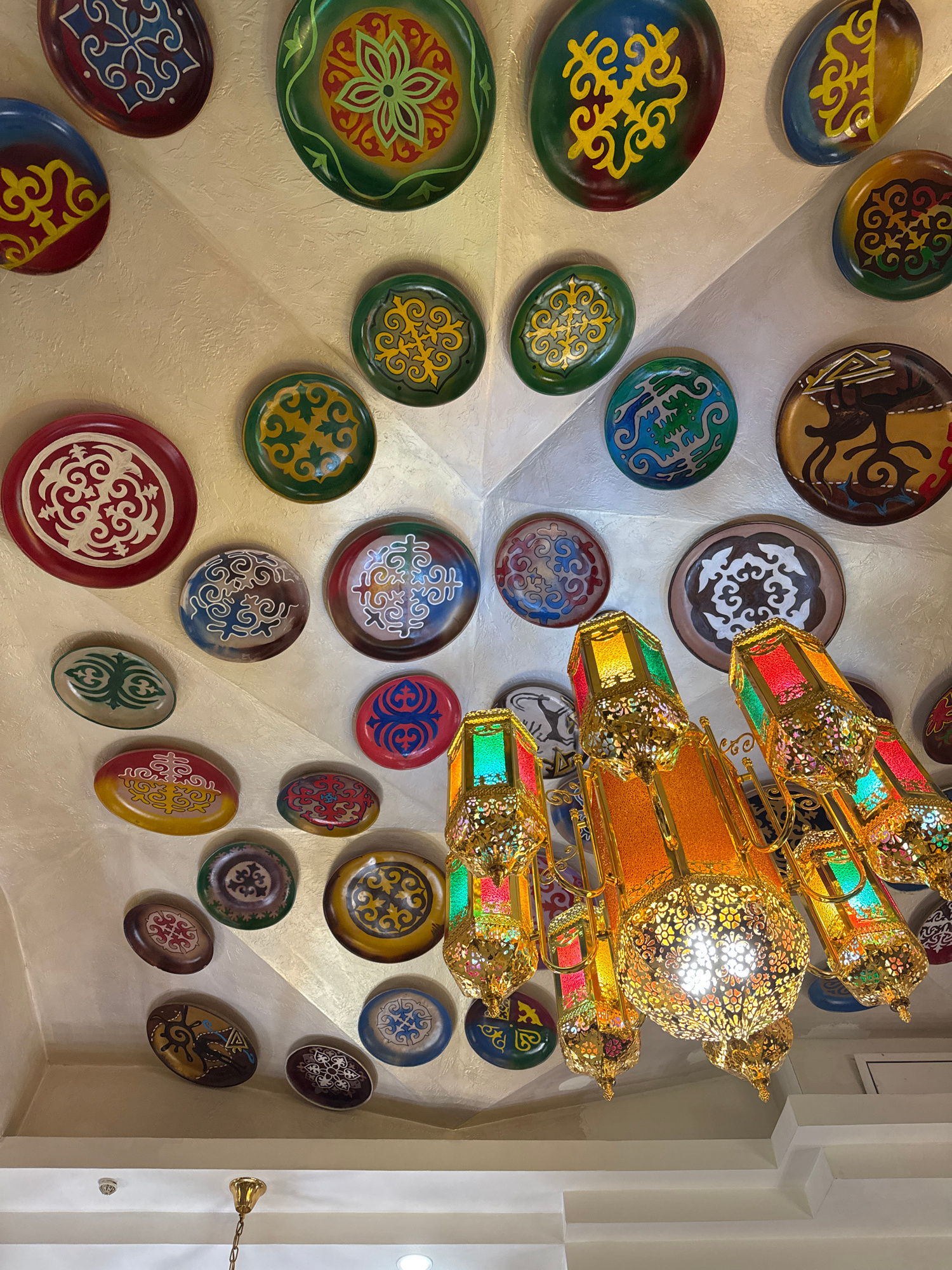 This image showcases a richly decorated interior wall adorned with numerous colorful, traditional plates and an elaborate chandelier. The setting suggests a public space like a restaurant, cafe, or ho…read more