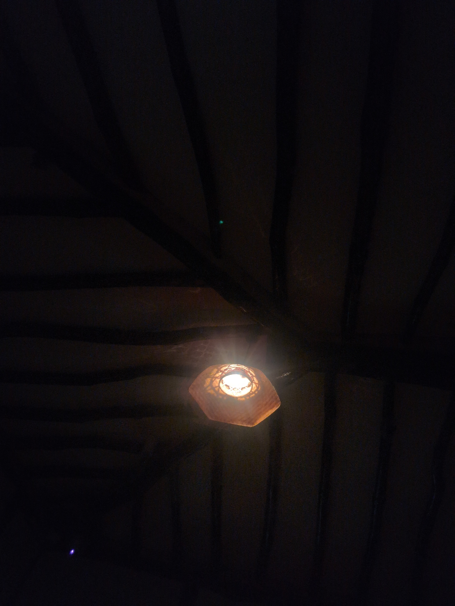 A dimly lit interior scene features a geometric, likely paper lantern hanging from the ceiling. The lantern's light illuminates the immediate surrounding area, revealing dark, horizontal ceiling beams…read more