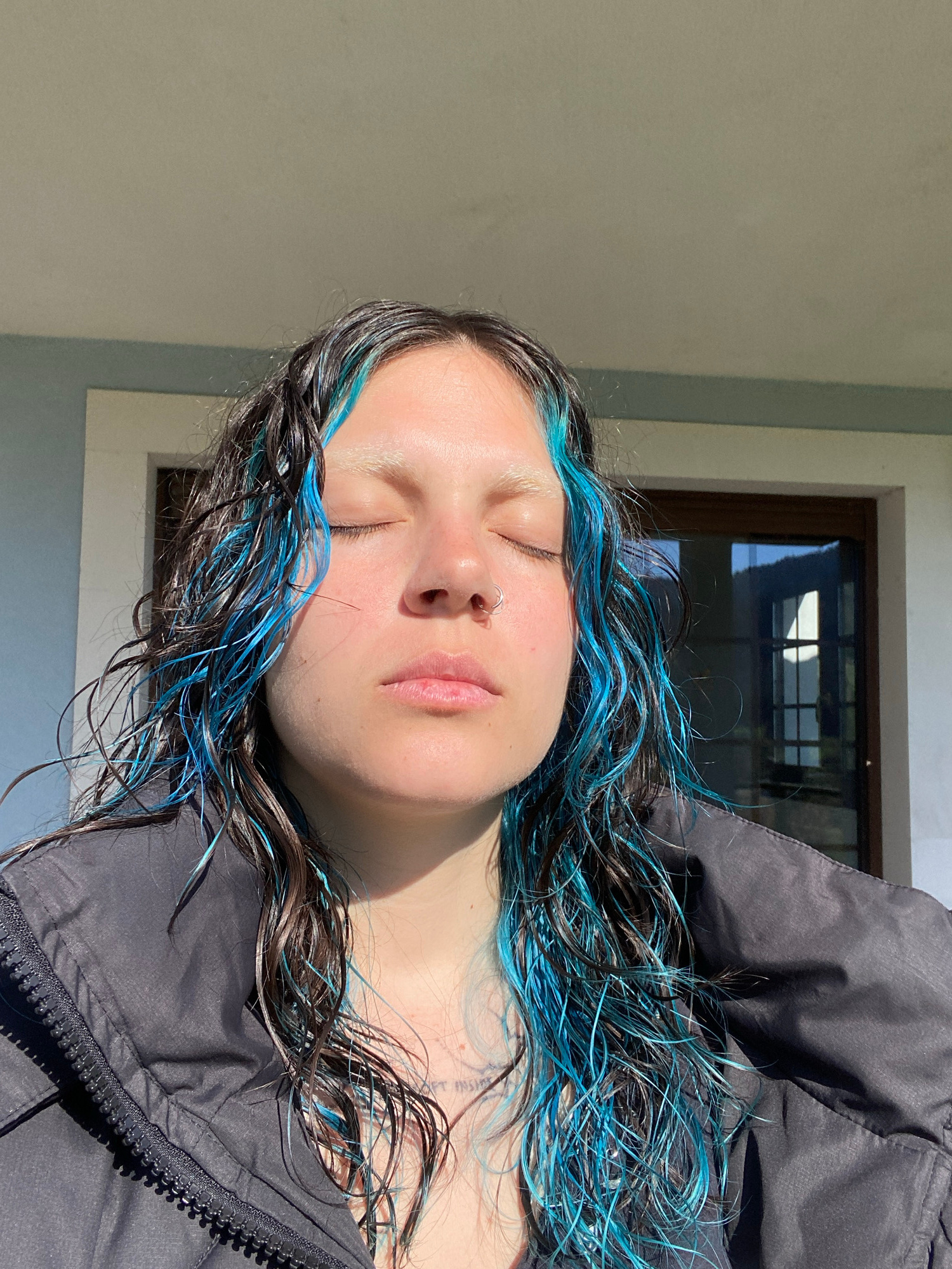 The image is an eye-level, portrait-oriented, medium shot featuring a woman with wet, dark hair streaked with bright blue. She has fair skin and closed eyes, with a silver nose ring visible. She's wea…read more