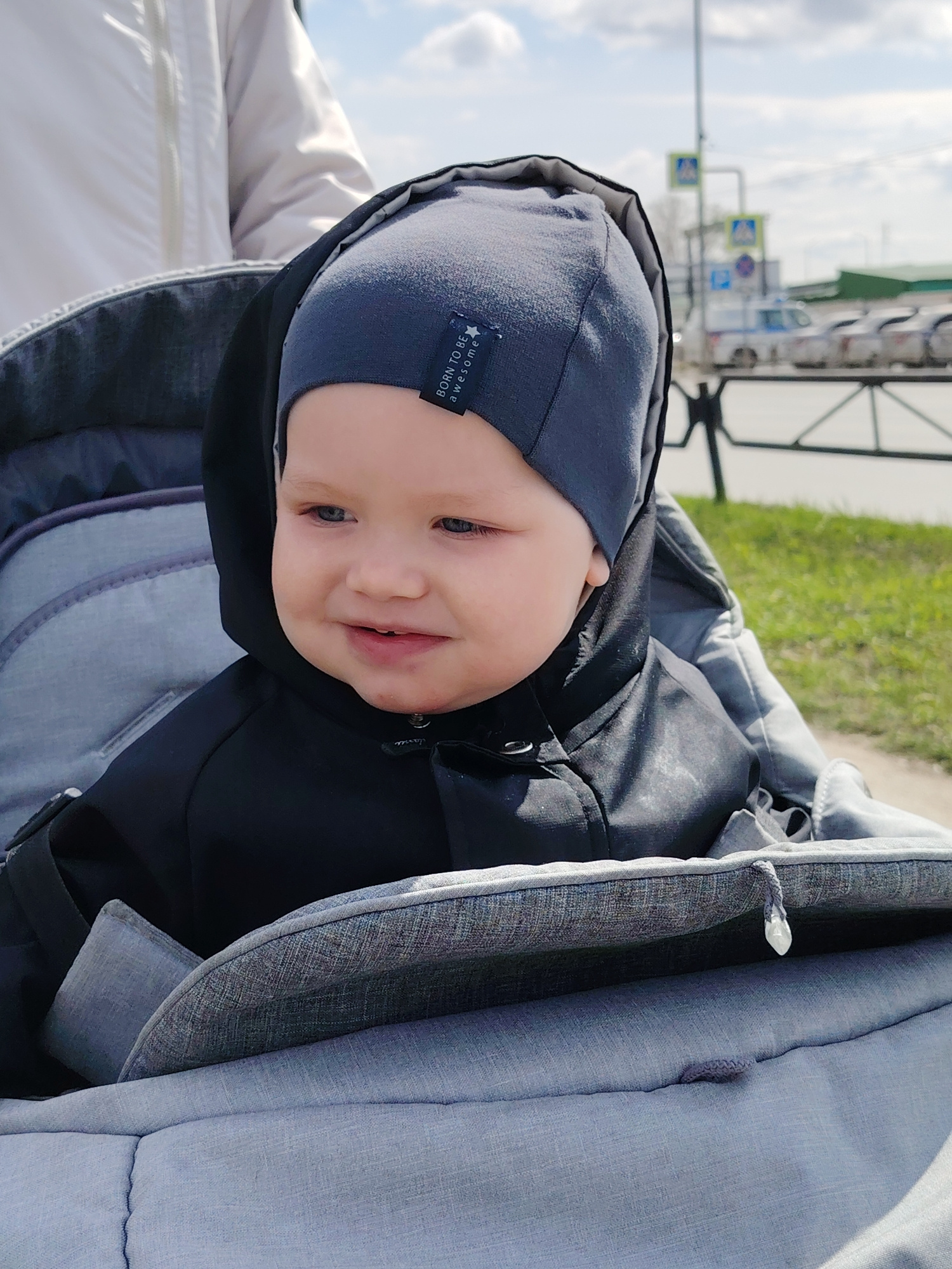 A baby sits in a stroller. The baby is wearing a gray cap and a black hooded jacket. The stroller is gray. Behind the stroller is grass and a road with parked cars. In the background, there is a stree…read more