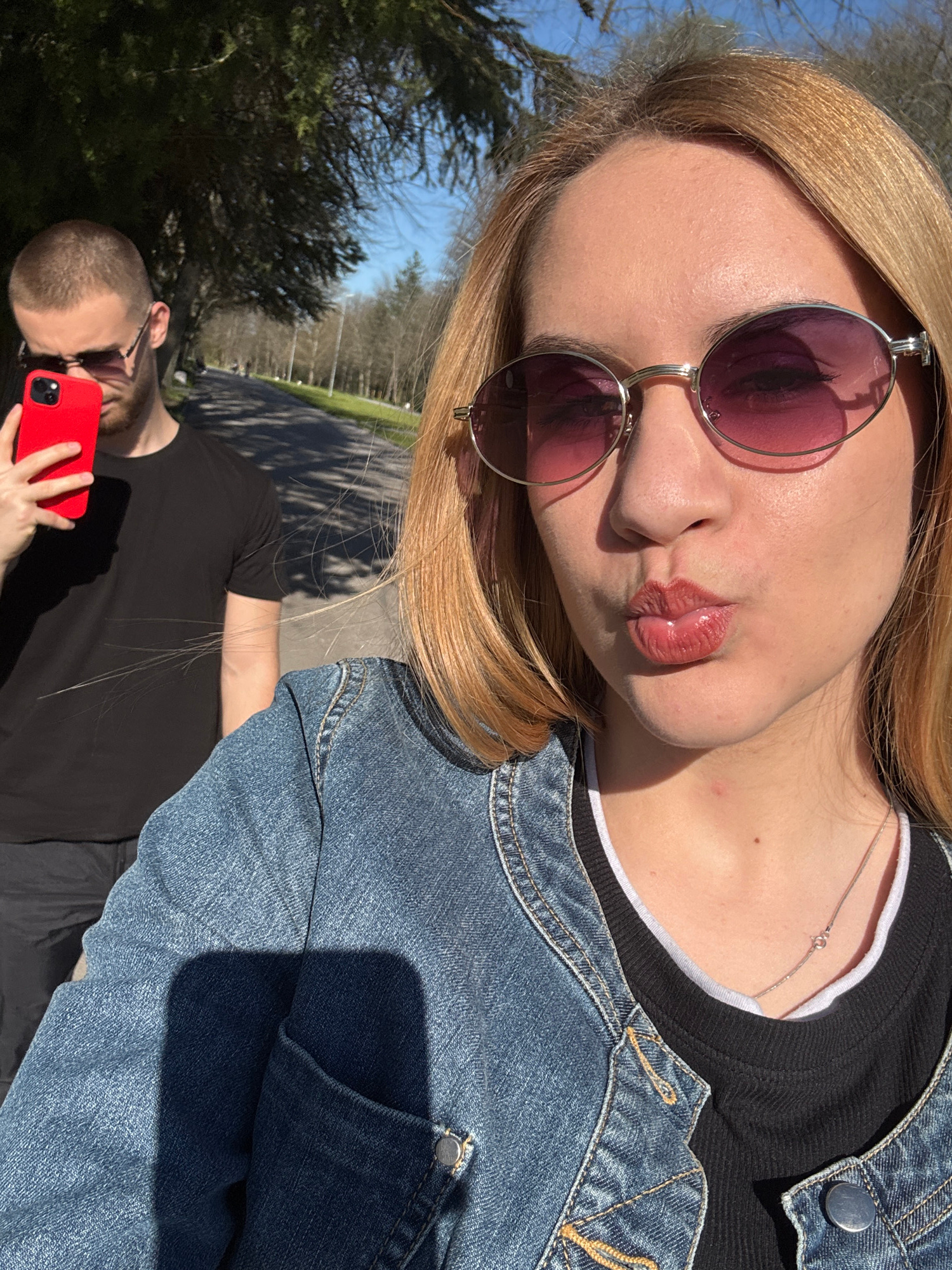 The image shows a selfie-style photograph of a blonde woman wearing pink-tinted sunglasses, a black top with white trim, and a blue denim jacket. Her lips are pursed. Behind her is a man with a shaved…read more