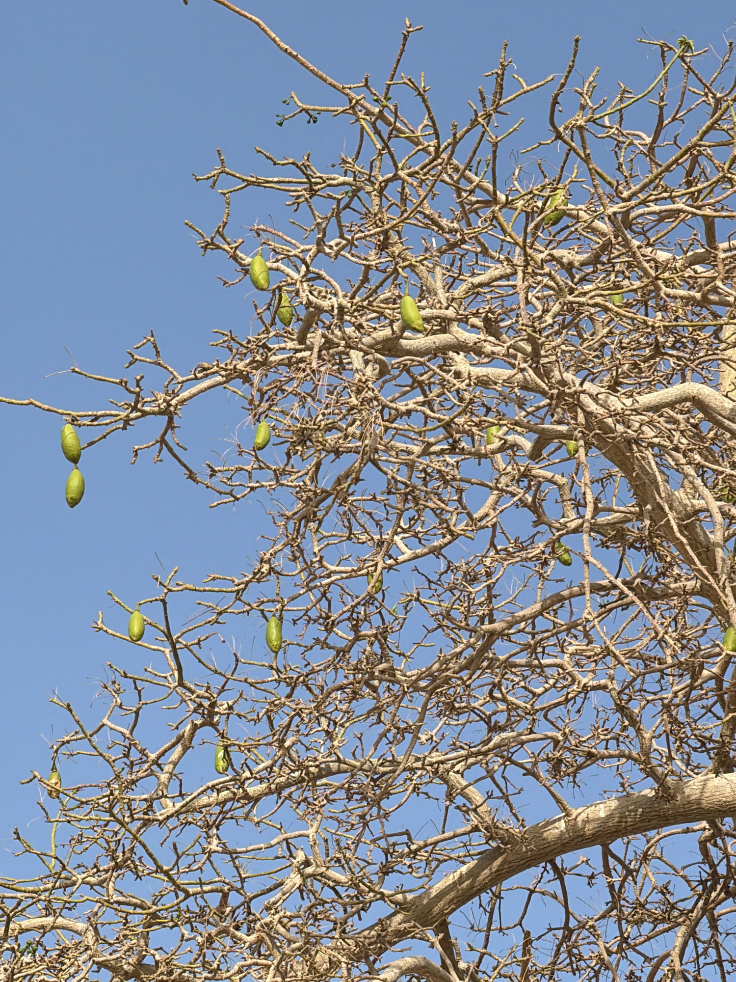 A close-up, upward-angled shot captures the intricate canopy of a deciduous tree against a clear, brilliant blue sky. The tree's numerous branches are predominantly bare, showcasing a dense, gnarled n…read more