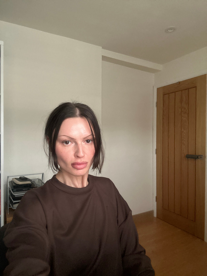 A female individual is depicted indoors in Tunbridge Wells, United Kingdom. She has dark, medium-length hair parted centrally, pulled back from her face, with some strands falling forward. Her facial…read more