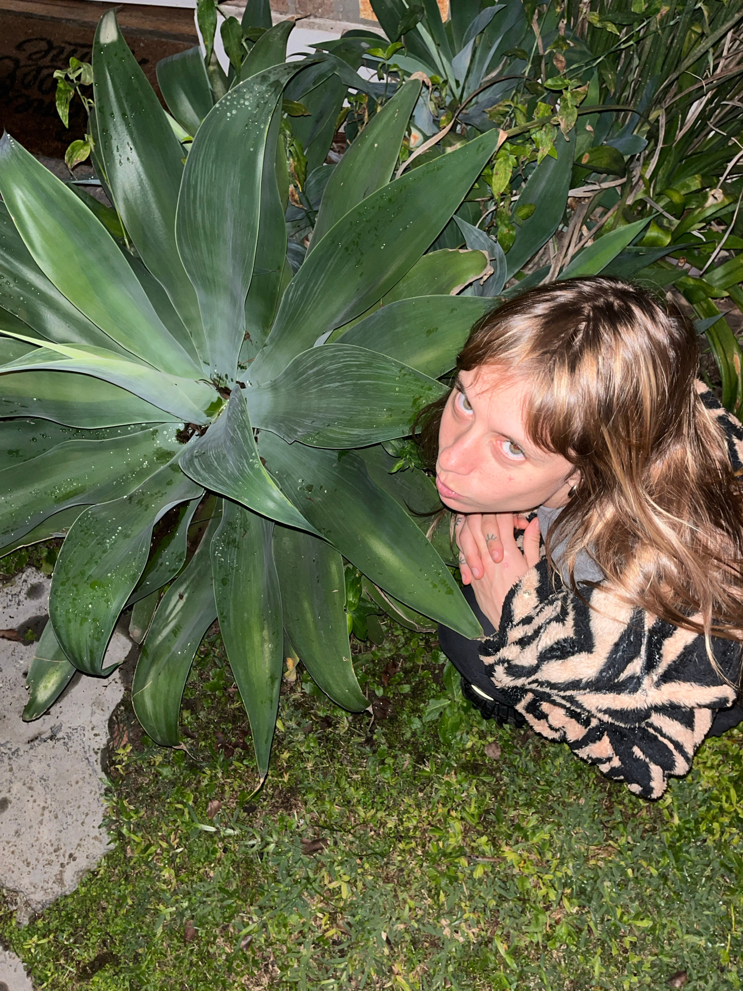 The image displays a young person lying or crouching in an outdoor setting, looking directly up at the camera. The subject has long, light brown hair and is wearing a fluffy black and beige zebra-prin…read more