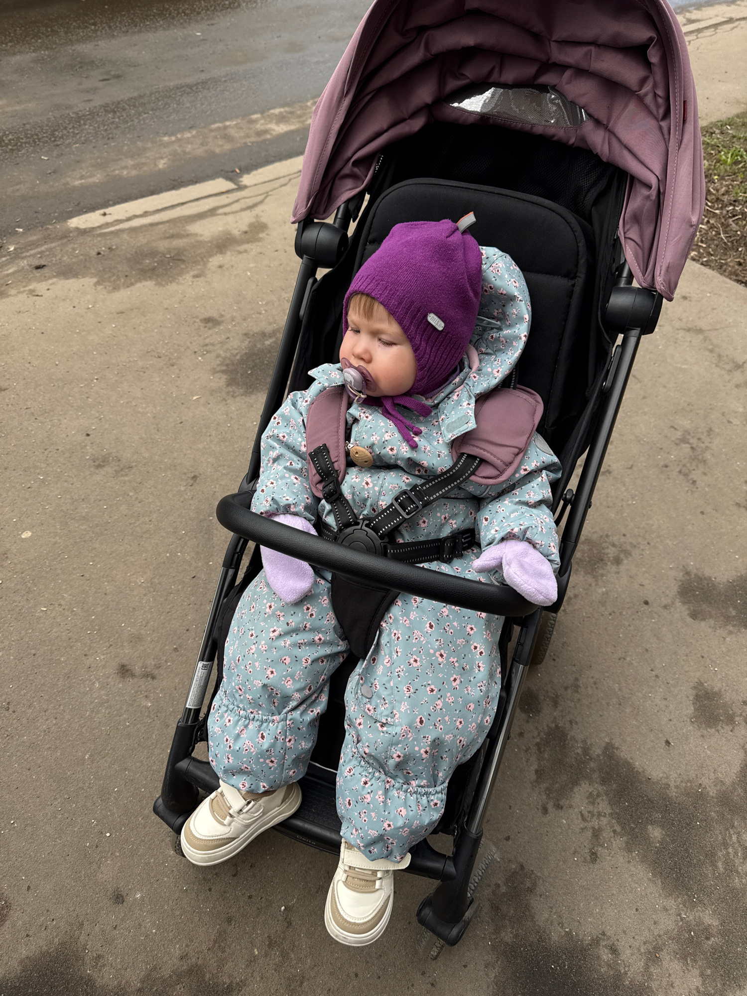 A baby is asleep in a black stroller with a partially collapsed purple sunshade on a gray concrete surface, likely a sidewalk. The baby is wearing a purple knit hat, a light blue floral patterned snow…read more
