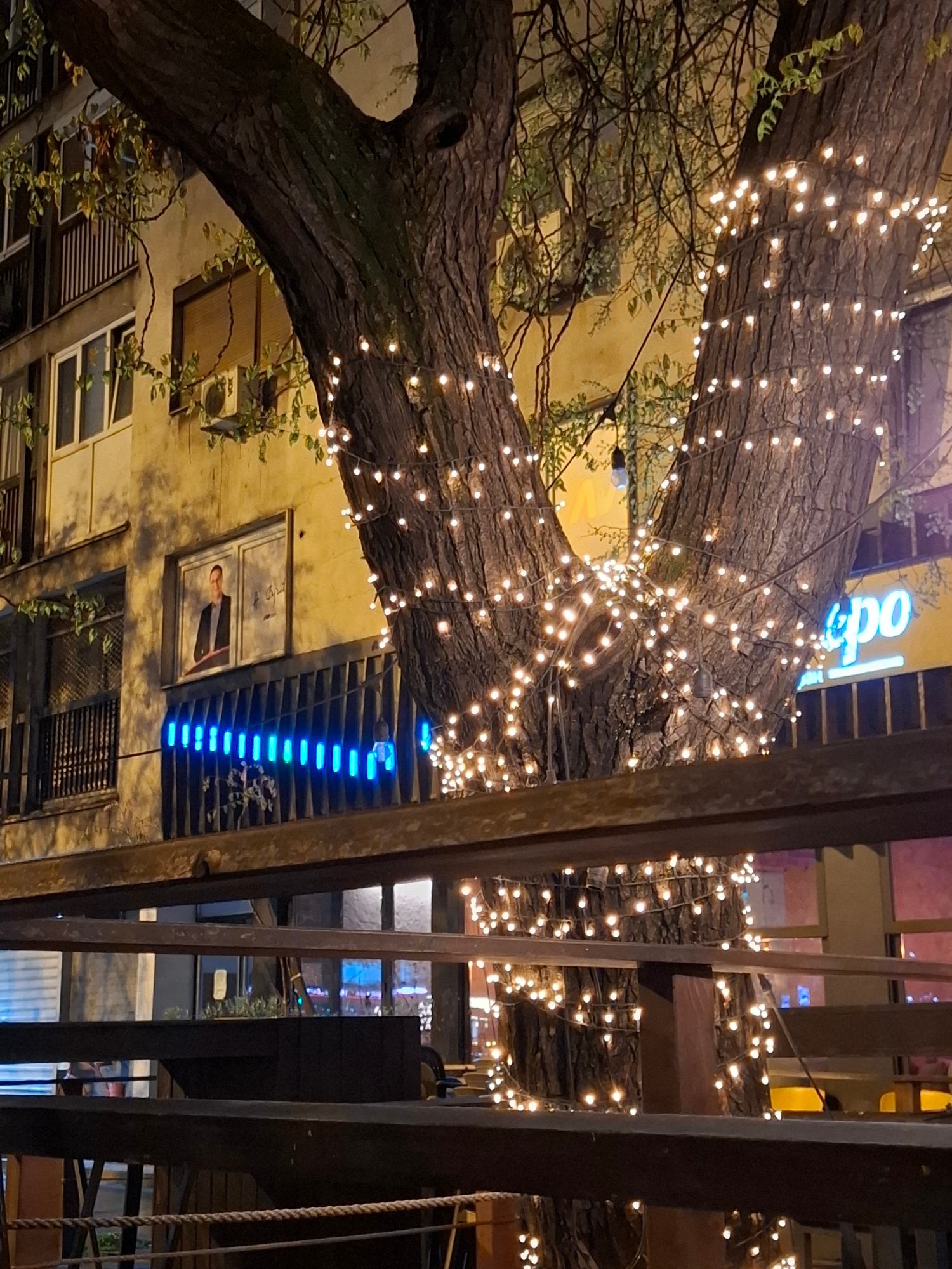 Captured at night, the image presents a unique perspective of a building facade integrated with natural elements and decorative lighting. The architectural structure exhibits a multi-story design, sho…read more