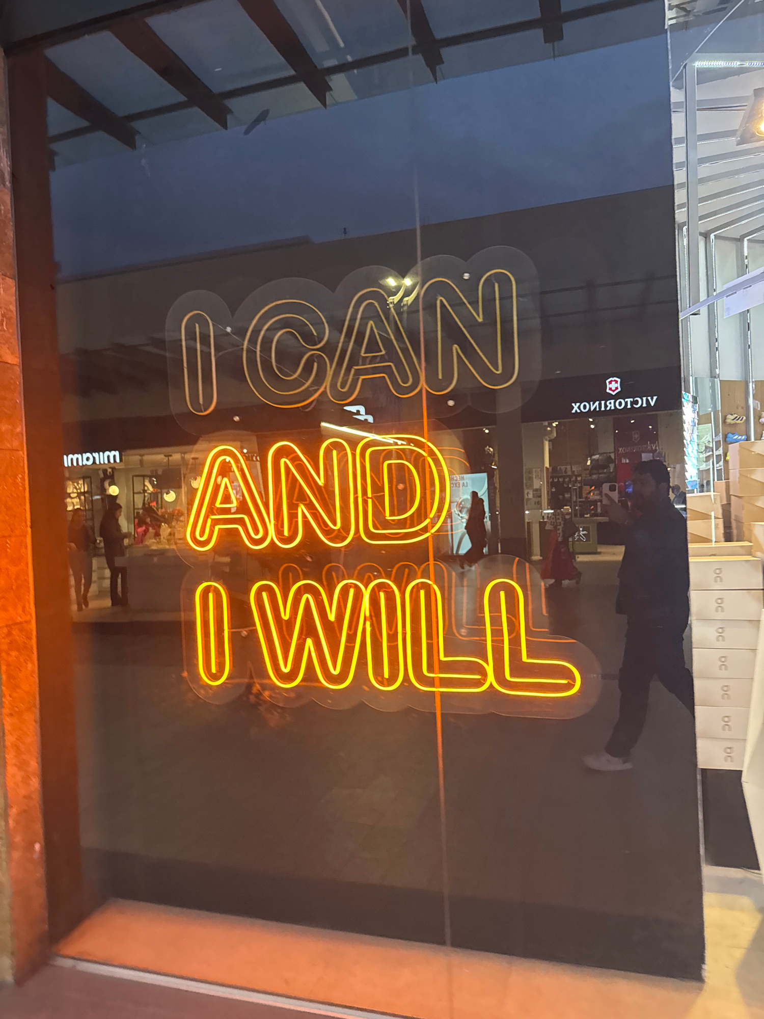 A daytime, indoor shot depicts a glass storefront in Puebla, Mexico, featuring a neon sign that reads "I CAN AND I WILL." The store displays the Victorinox logo above the neon sign. The foreground and…read more