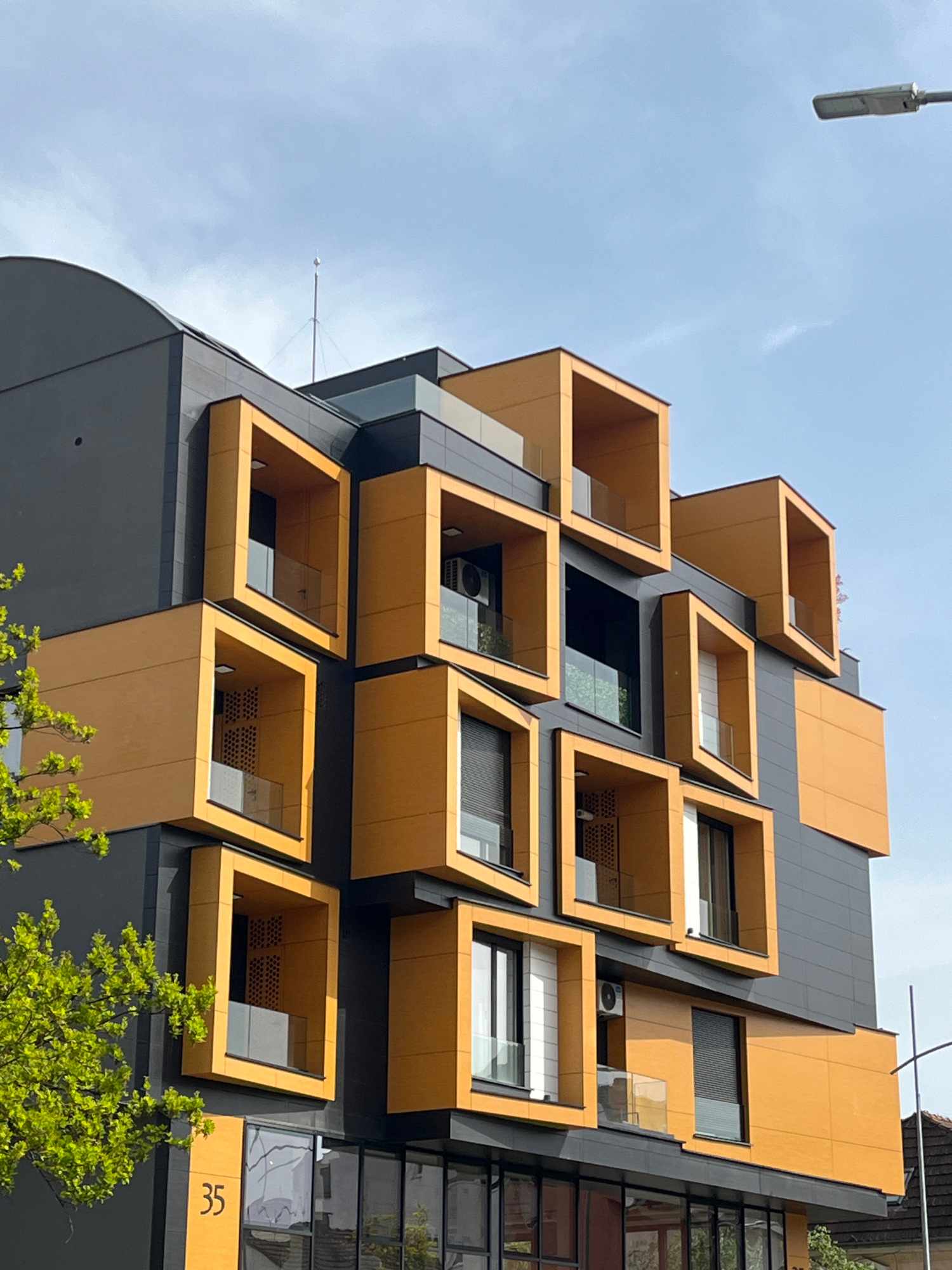 The image captures a modern architectural building in Novi Sad, Serbia. The building has a striking design with a dark gray facade and protruding gold-colored, cube-shaped window frames. Some of the c…read more