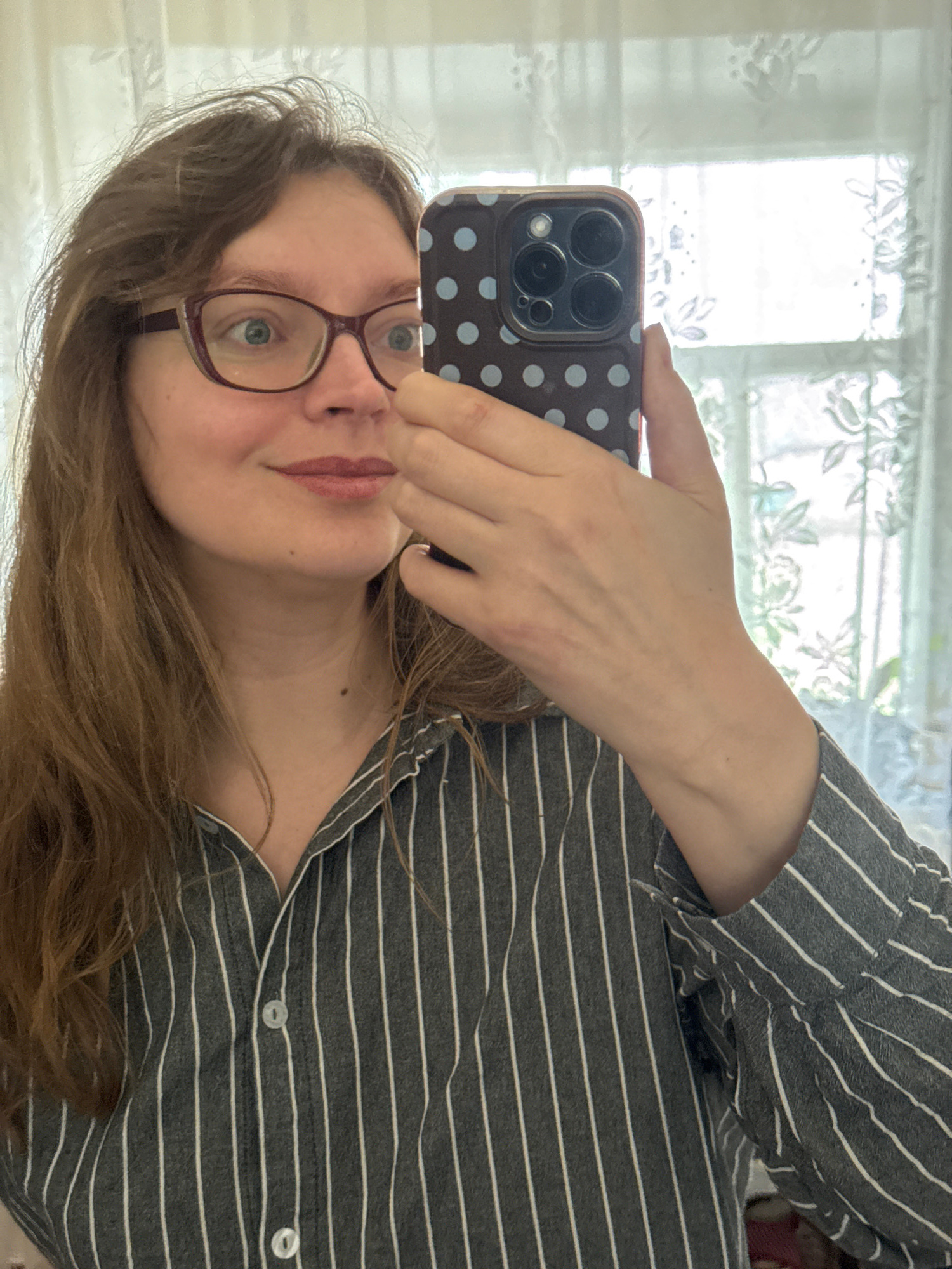 The image, rotated 90 degrees counter-clockwise, depicts a woman indoors in Aksay, Kazakhstan, holding a smartphone in her right hand, seemingly taking a selfie. She has light brown hair, wears eyegla…read more