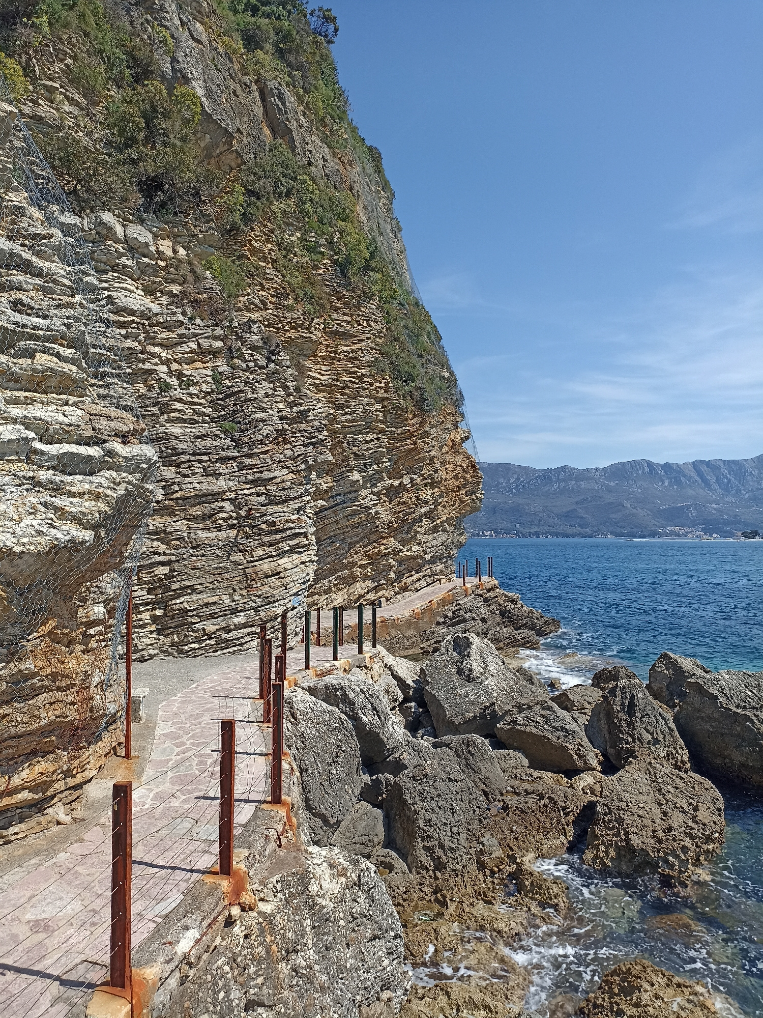 A coastal scene shows a narrow paved path winding along the base of a stratified cliff face in Budva, Montenegro. The cliff is composed of layered sedimentary rock, reinforced with wire mesh to preven…read more