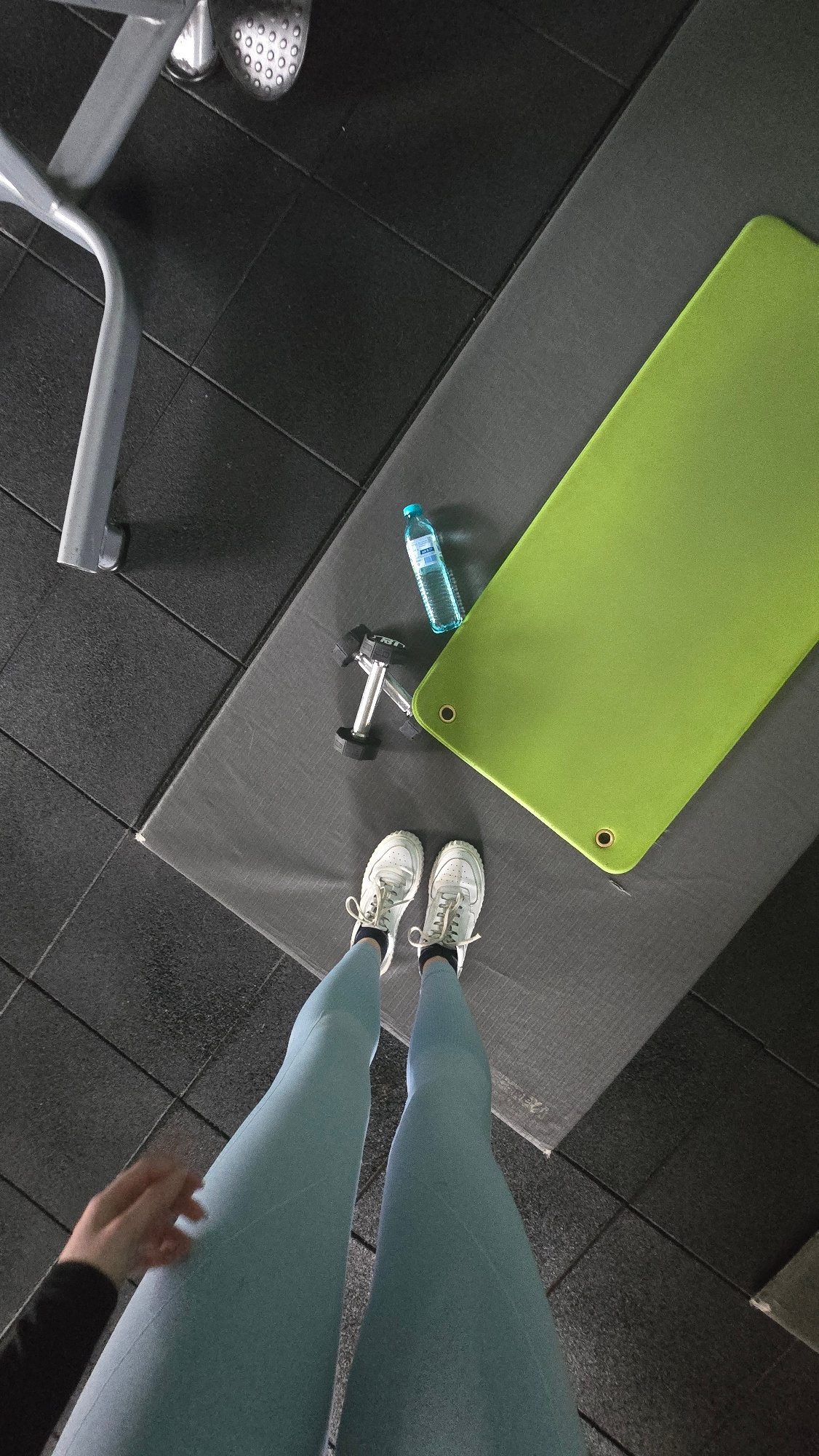 The image presents a high-angle view of a gym setting. On a grey mat lies a bright green yoga mat, alongside a water bottle and a small dumbbell set. A person wearing light blue leggings and white sne…read more