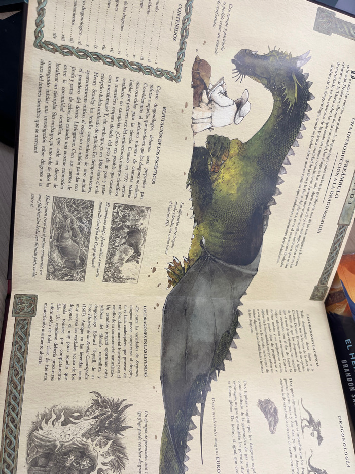 The image displays an open, large format book, likely a fictional field guide or encyclopedia dedicated to "Dragonology." The book is open to two pages, with a significant illustration spanning both.…read more