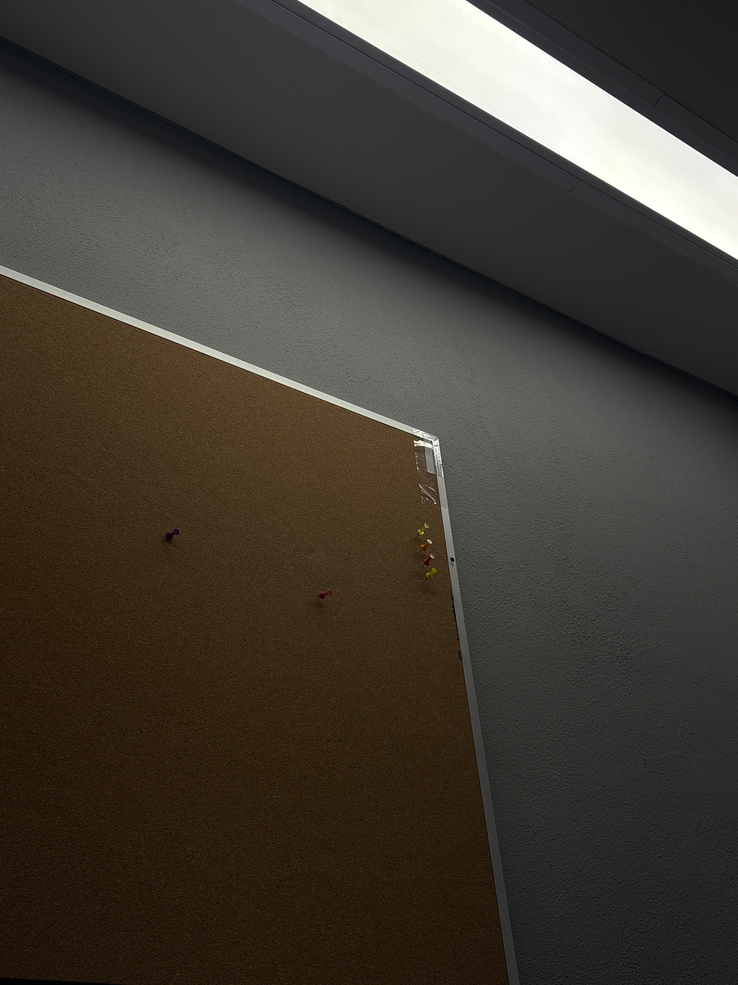 The image shows a section of a room with an angled ceiling. A fluorescent light fixture is mounted to the angled ceiling. On the wall is a corkboard with a silver frame. Several pushpins are stuck int…read more