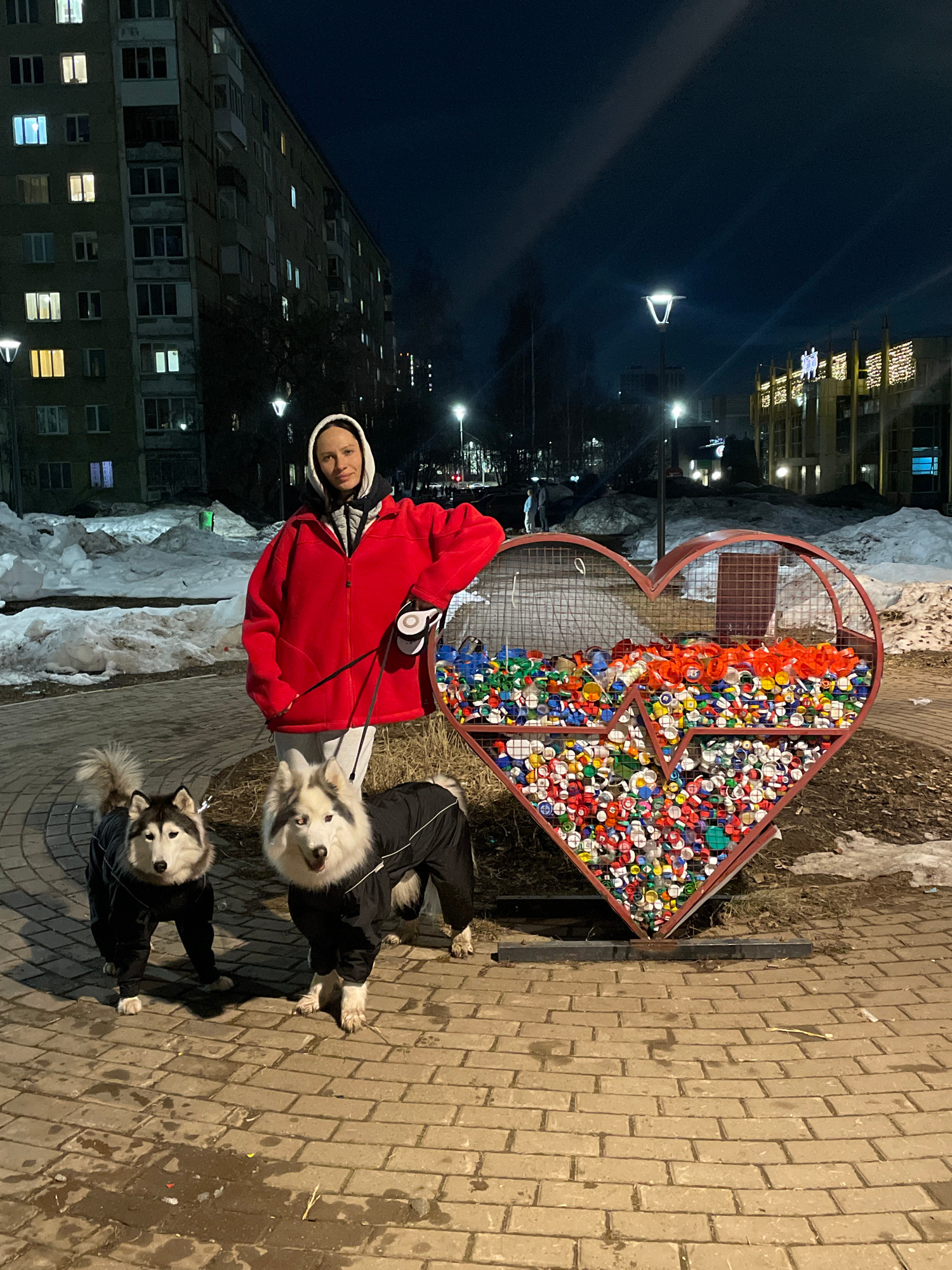 A medium shot shows a woman standing next to a heart-shaped wire container filled with colorful plastic bottle caps with two dogs on leashes, on a brick pathway. The woman wears a red jacket and grey…read more