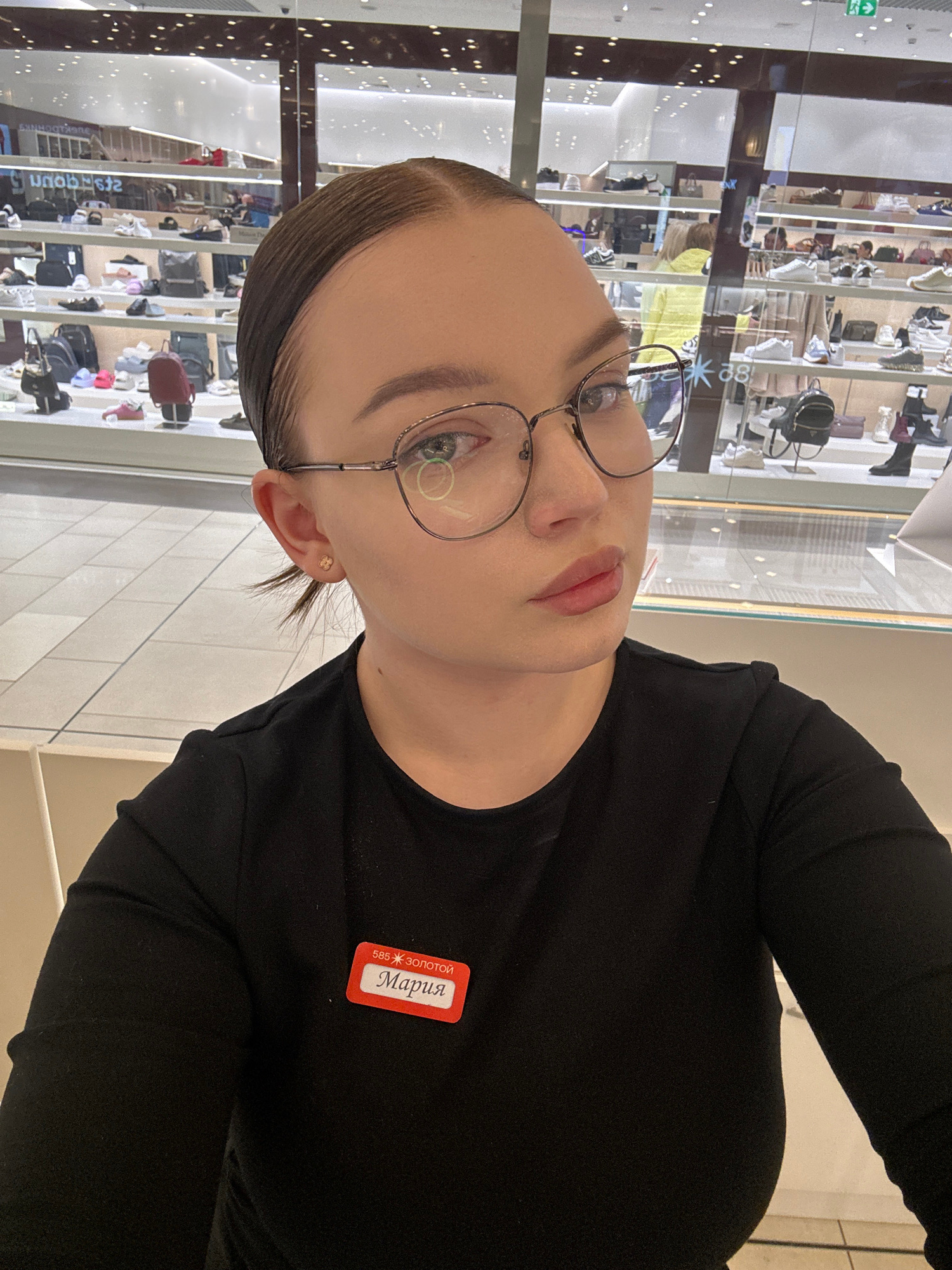 A woman with slicked-back brown hair and wearing wire-frame glasses is posing for a selfie. She is wearing a black long-sleeved shirt with a red name tag pinned to the chest. The name tag reads "Мария…read more