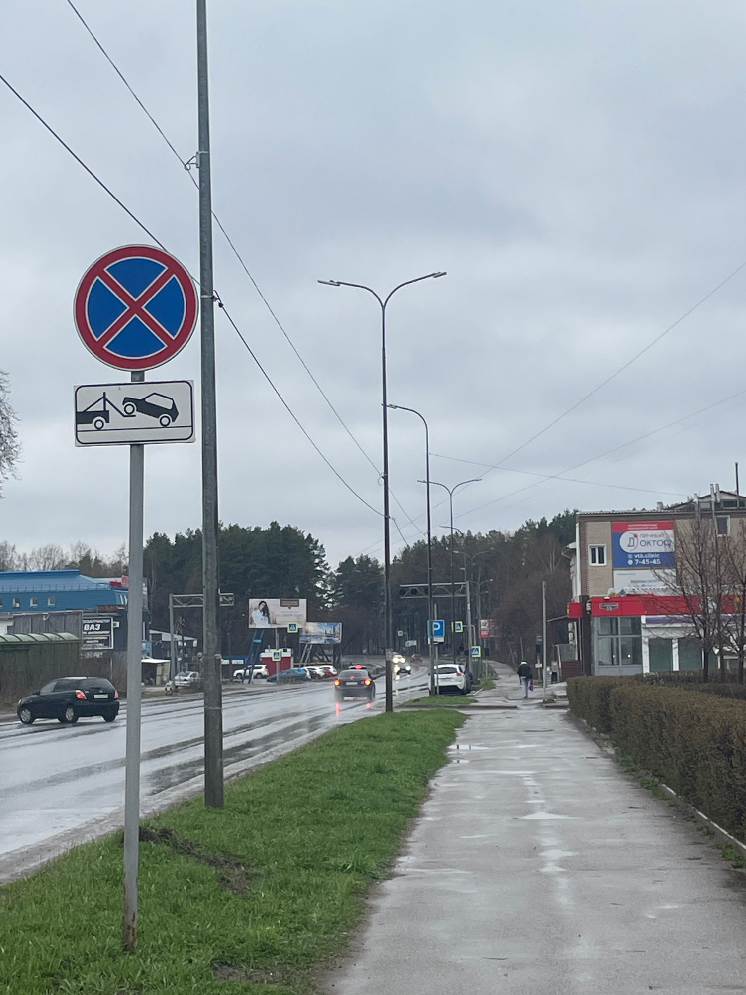 This image captures an overcast daytime street scene in Chaikovsky, Russia, likely after a period of rain, as evidenced by the wet asphalt and grass. The perspective is from the side of a road, lookin…read more